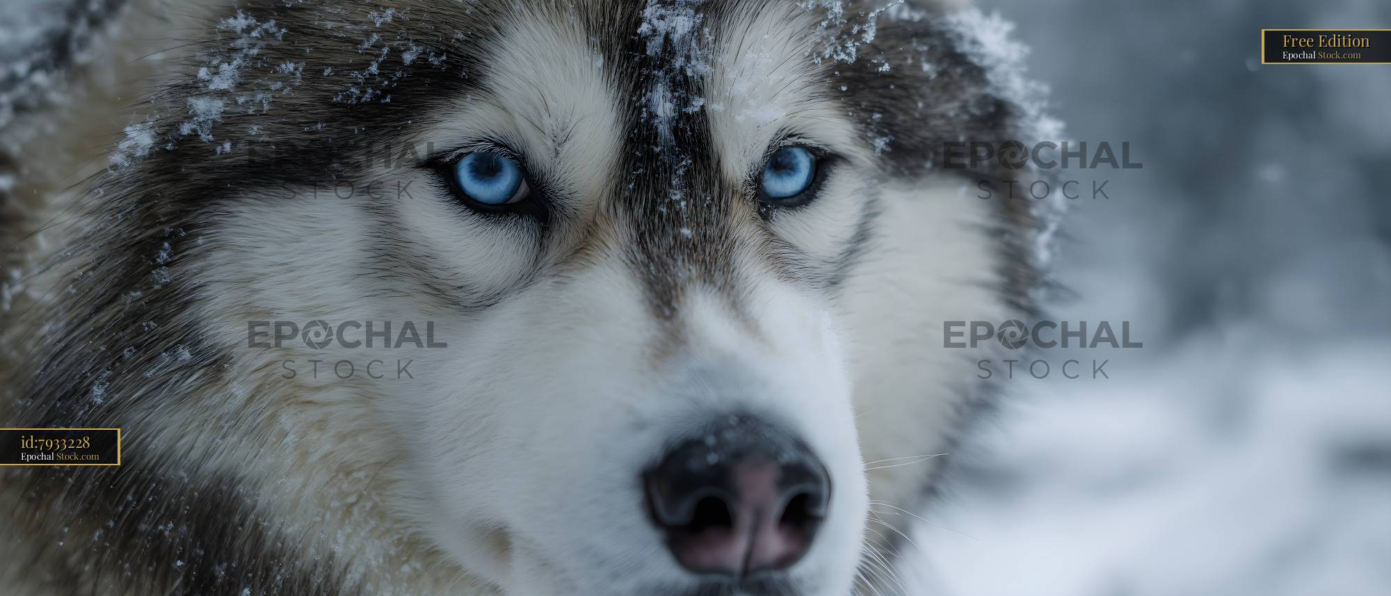 Husky stands in snow with clear blue eyes and snowy fur Free Premium Stock Image