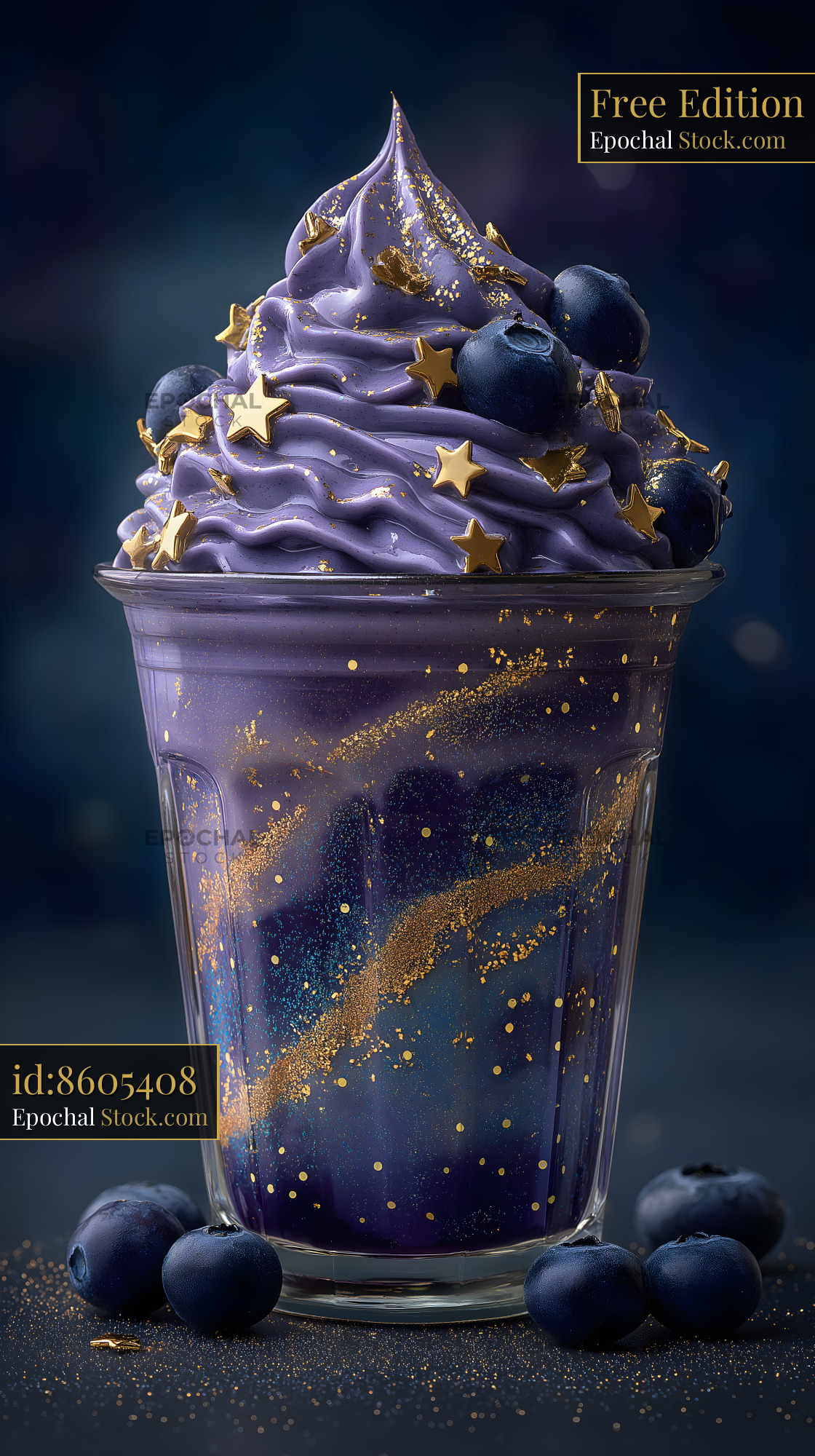 A clear cup holds purple soft serve ice cream topped with fresh blueberries and golden stars. The dessert is set against a dark background that adds to its bright colors.