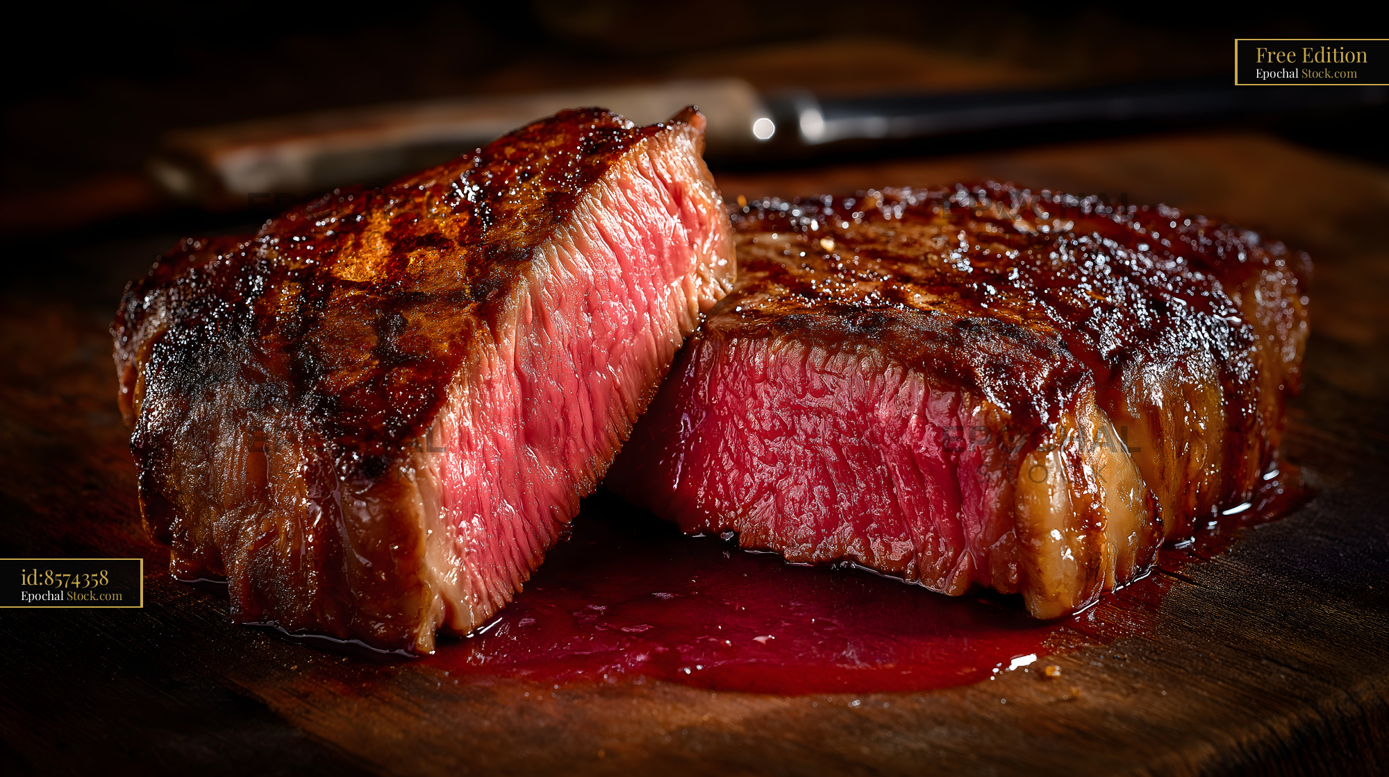Two pieces of steak are sliced open on a wooden board. The inside shows a rich red color, and juices are visible. A knife rests nearby, suggesting preparation for a meal.