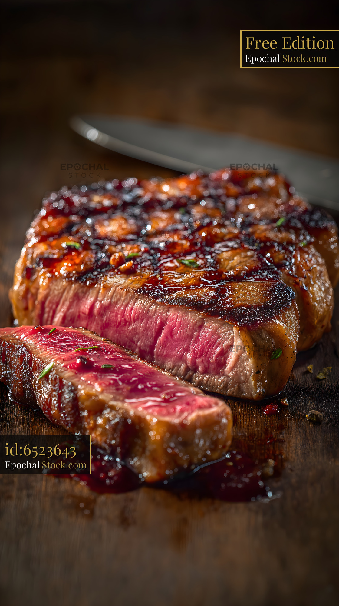 Juicy steak cut on wooden board with knife in background Free Premium Stock Image