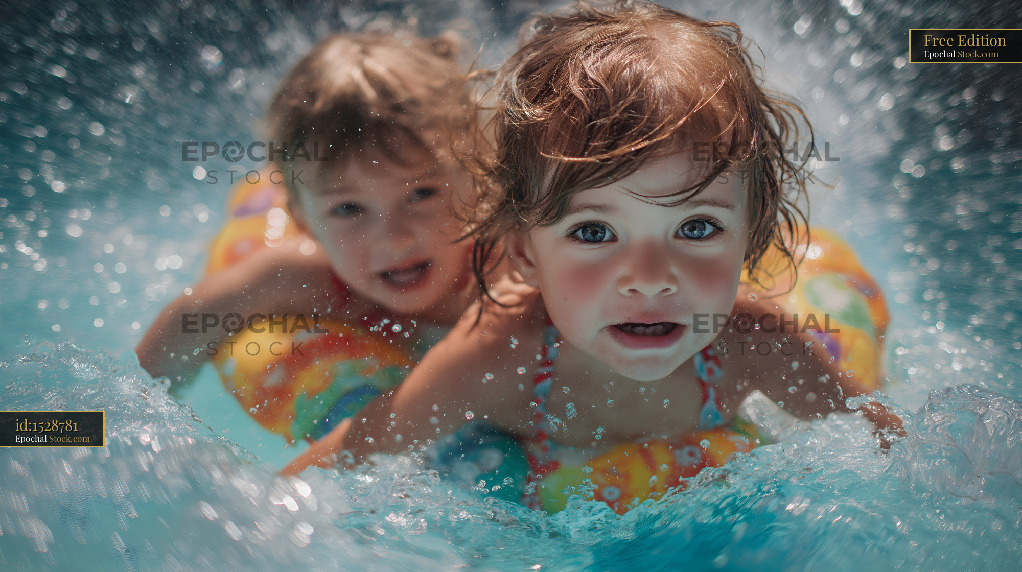 Two children play in a pool, splashing water as they swim. They laugh and have fun while using colorful inflatable rings during a bright and warm afternoon.