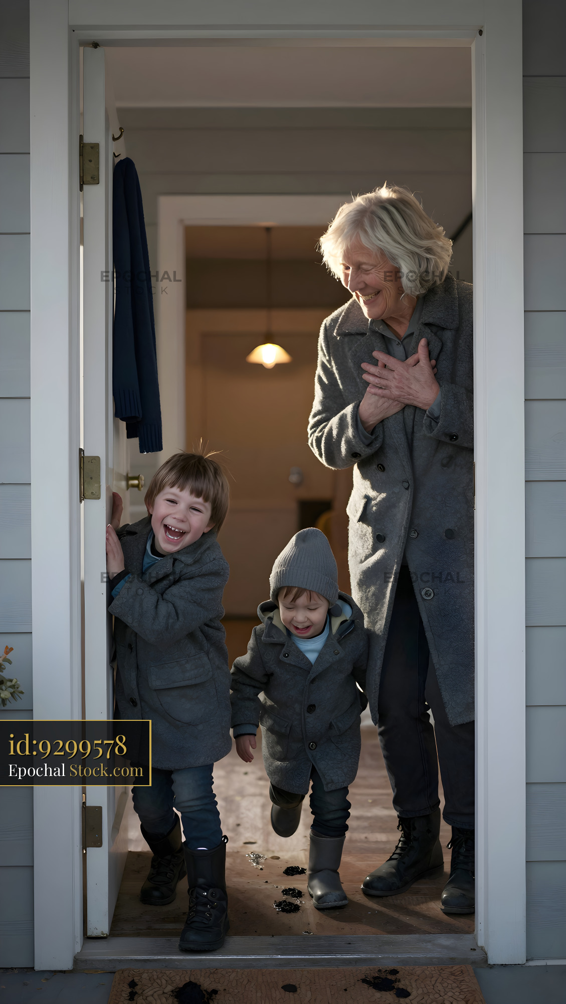 Two young boys run to their grandmother as she stands at the door. They are happy and wearing gray coats, while the grandmother smiles in a warm, welcoming moment.