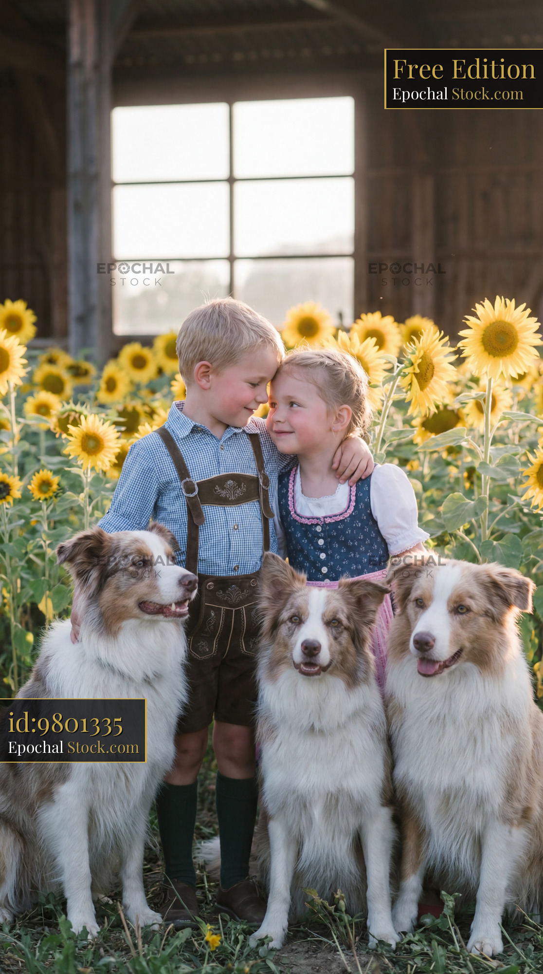 Two children stand together in a field of sunflowers. They smile at each other while three dogs sit in front of them. The sun shines brightly over the scene, creating a joyful atmosphere.