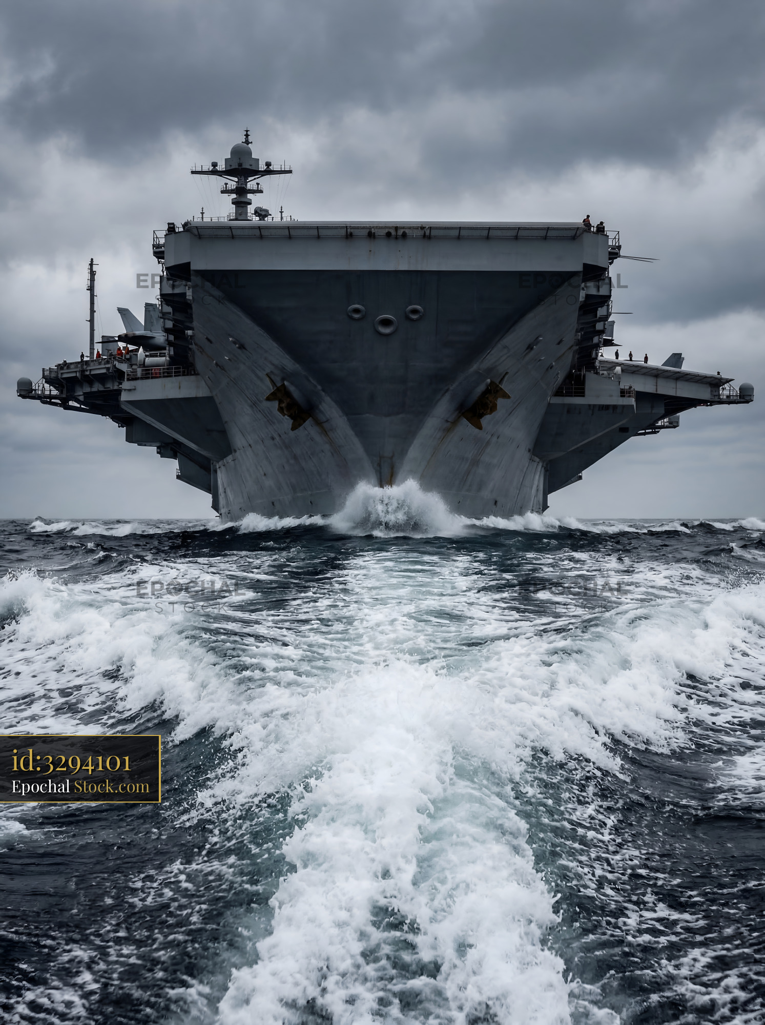 Large aircraft carrier moving through ocean waves in bad weather Premium Stock Image