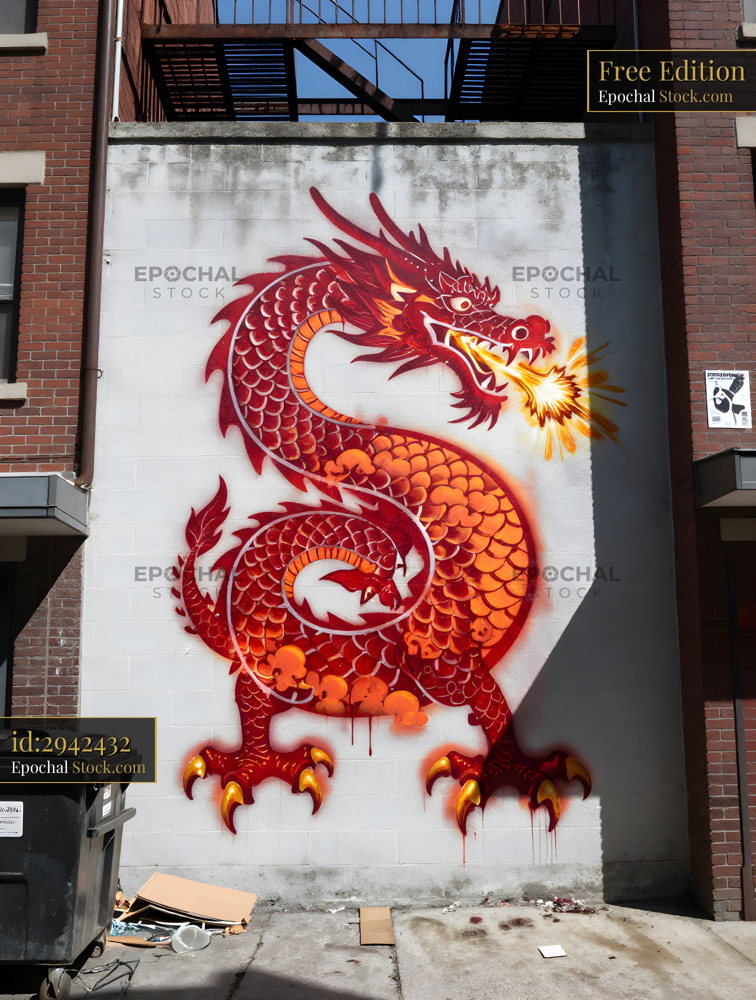 Large red dragon mural on a building wall in urban area Free Premium Stock Photo