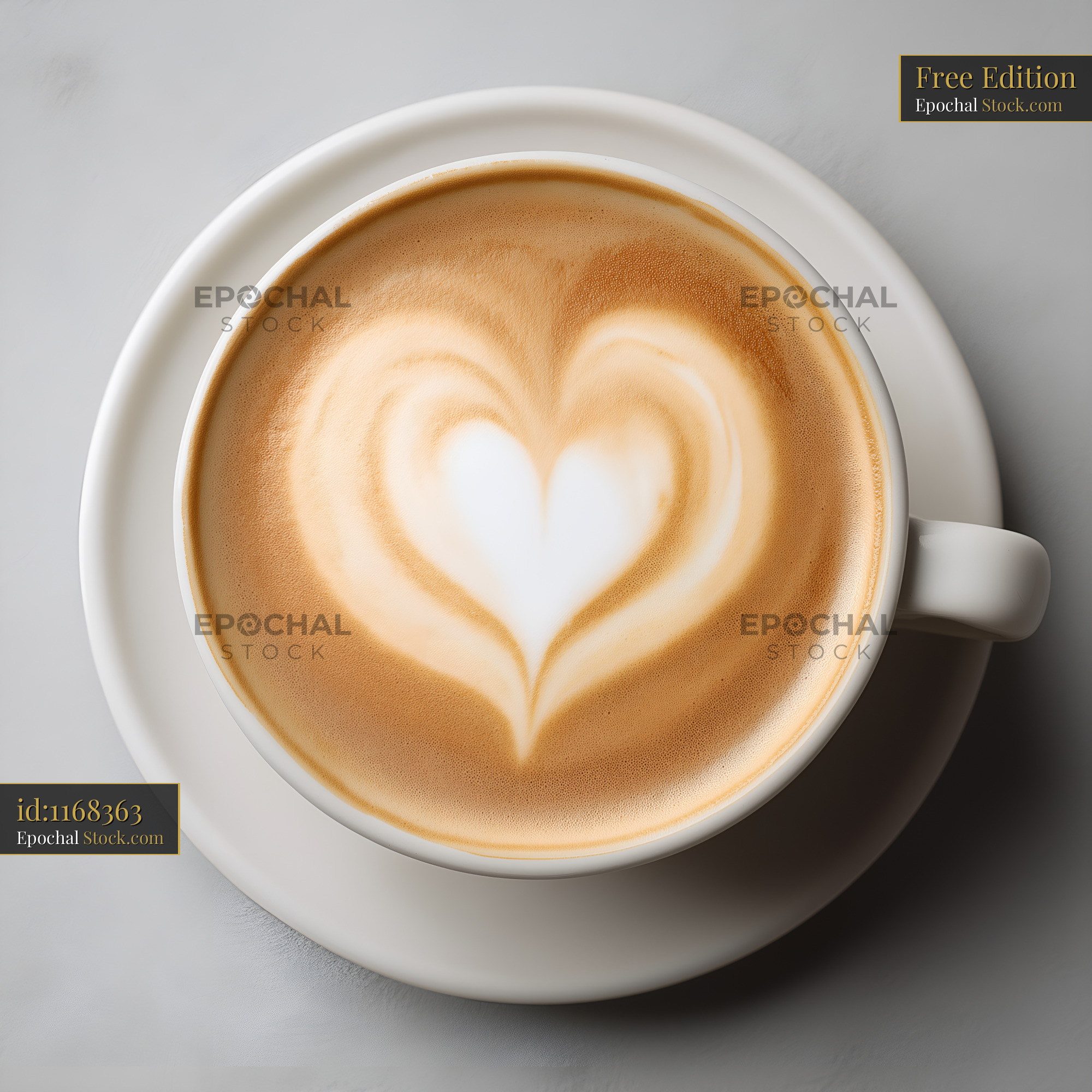 A cup of latte sits on a white plate. The drink features a heart design made from milk foam. The setting is simple and focuses on the coffee.