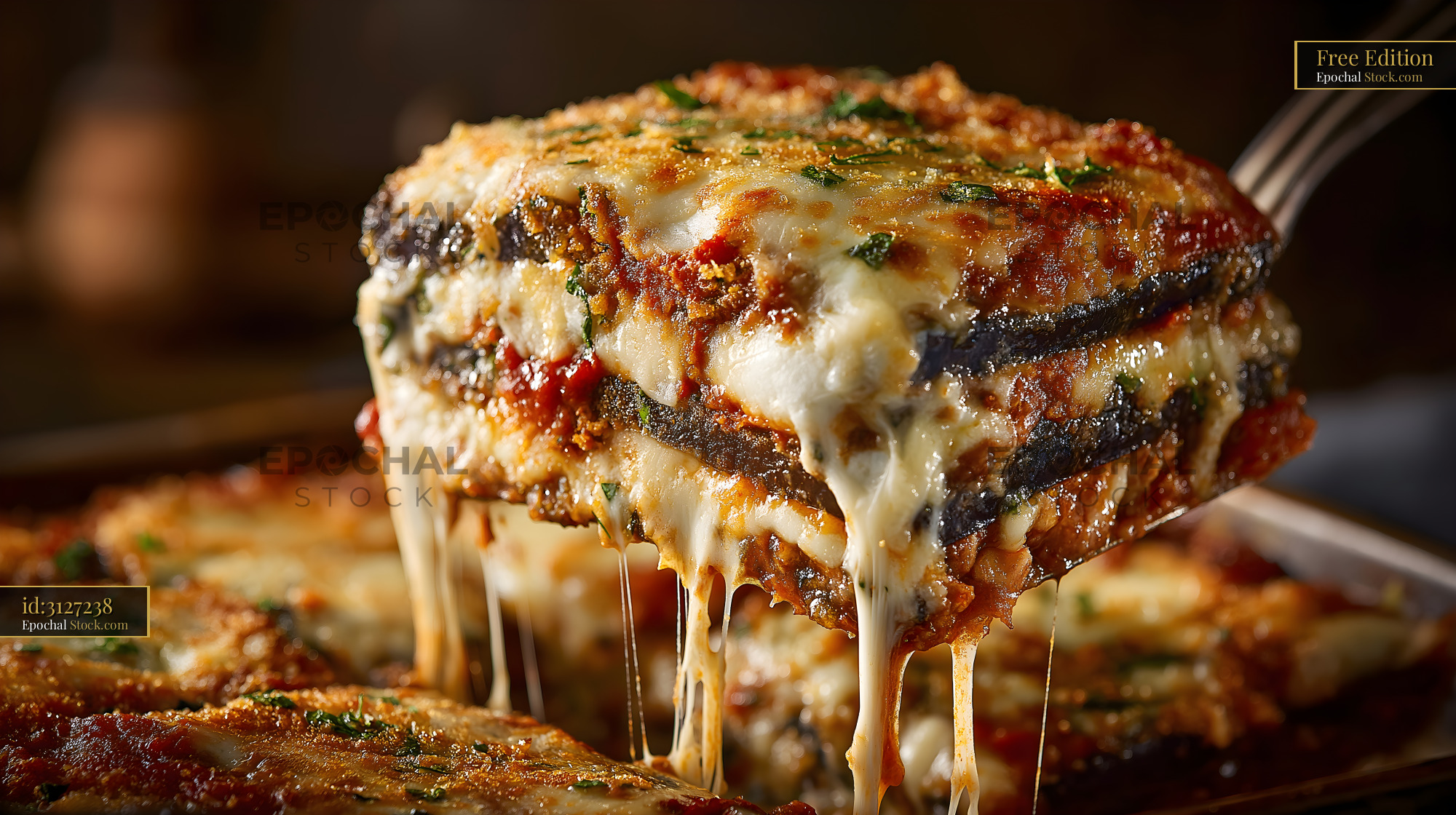 Layered dish with cheese being served at a dinner table Free Premium Stock Image
