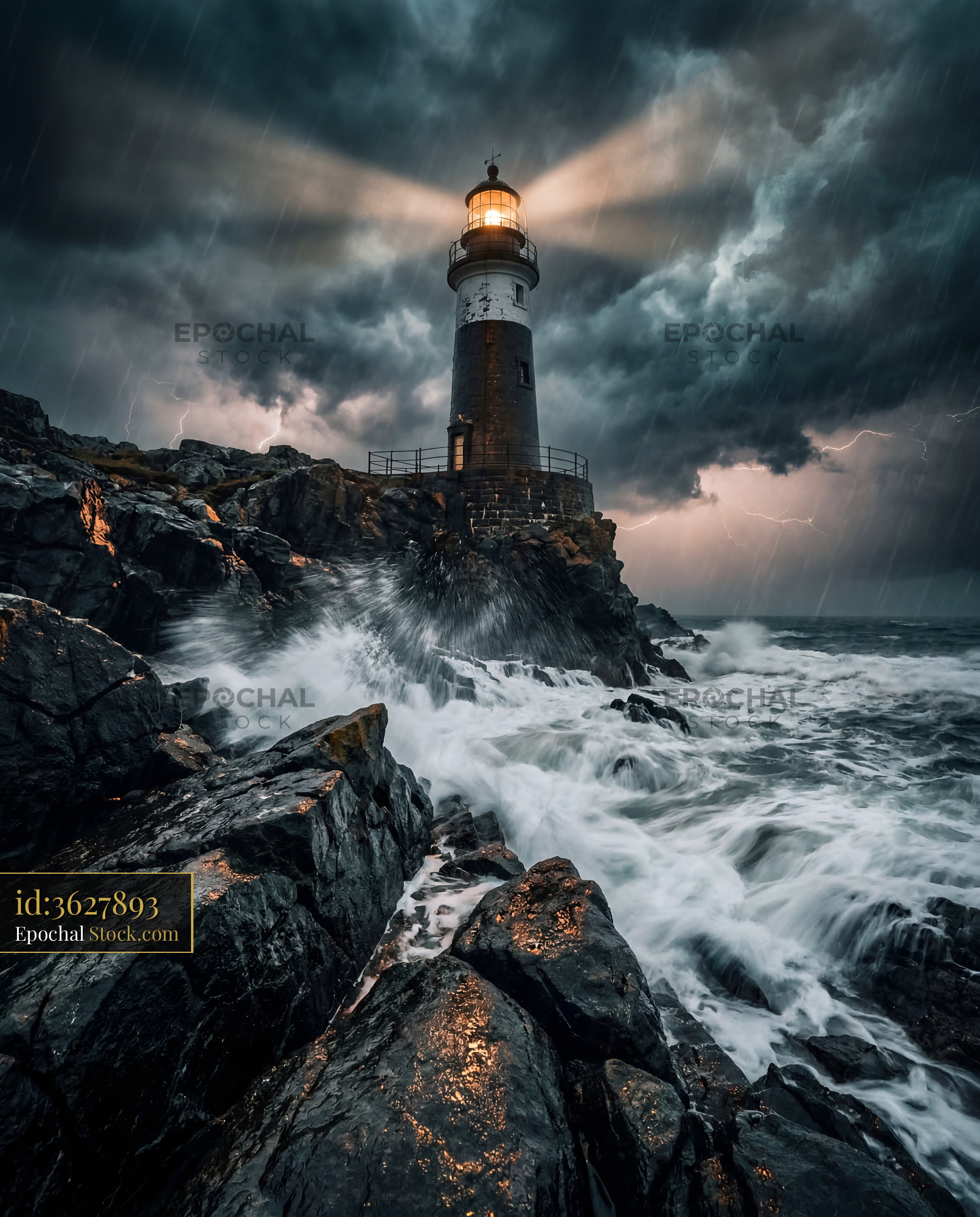 Lighthouse shines bright during stormy weather in the ocean Premium Stock Image