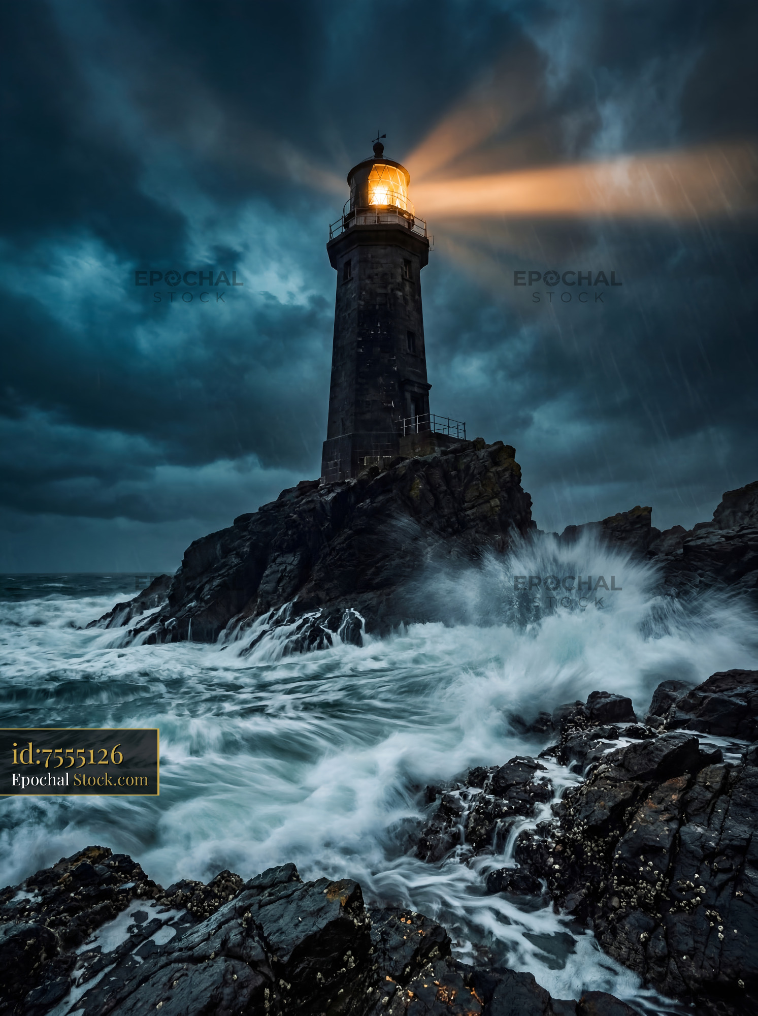 A lighthouse towers above rocky shores as powerful waves crash against the rocks. Dark clouds dominate the sky while the lighthouse light shines through the storm.