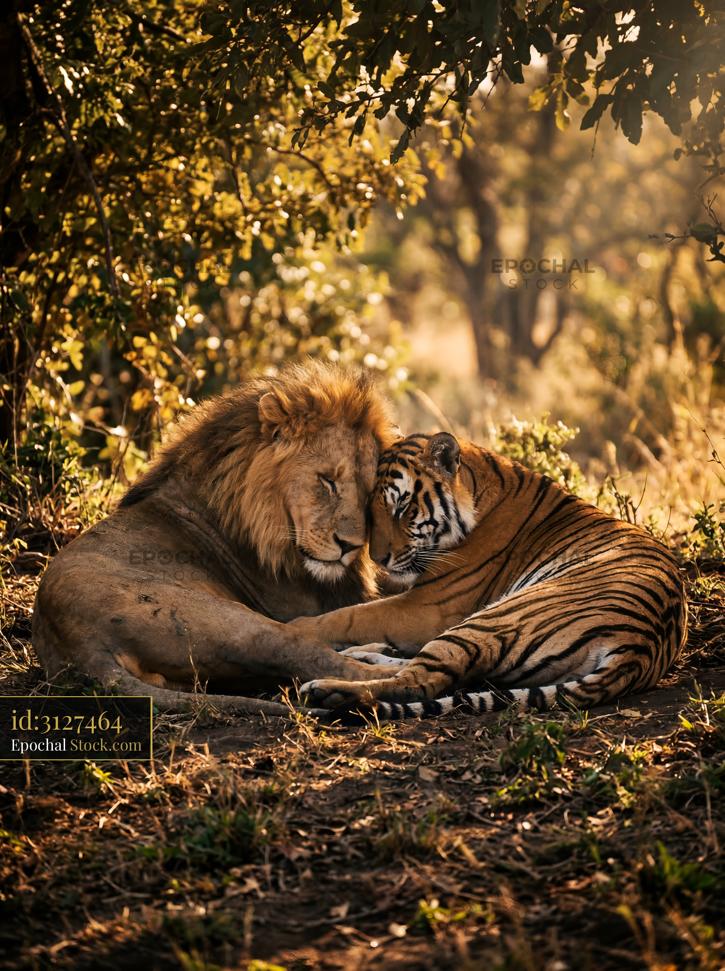 Lion and tiger rest together in warm sunlight under trees Premium Stock Image