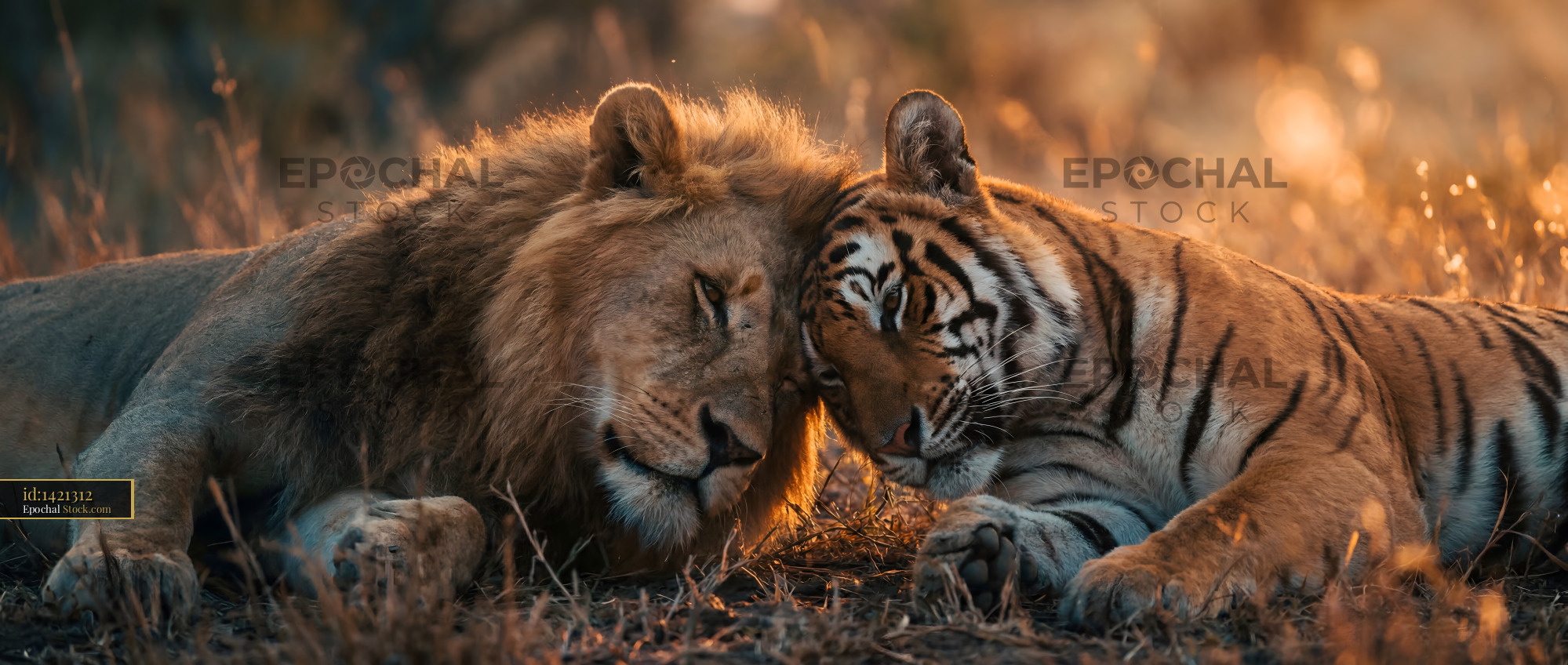 Lions and tigers resting together in the wild during sunset Premium Stock Photo