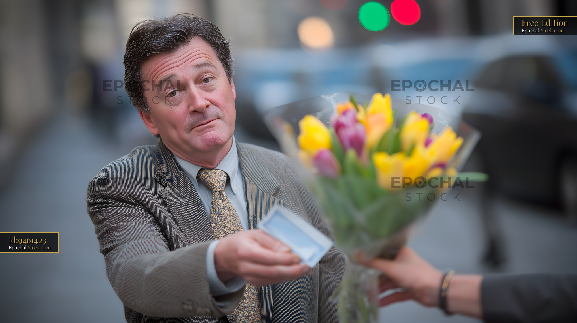 A man in a suit stands on a city street. Another person hands him a bouquet of flowers and a card. Cars and traffic lights are in the background.