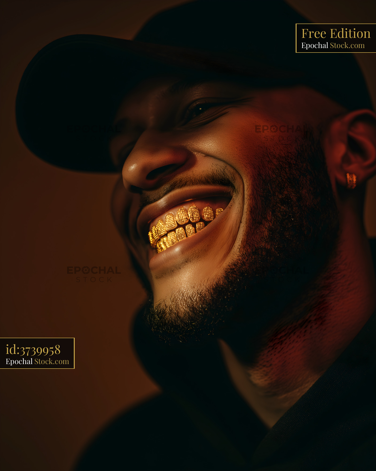 A man wearing a black cap smiles wide to show off his gold grill teeth. The background has soft lighting that highlights his face. He appears confident and relaxed at the moment.
