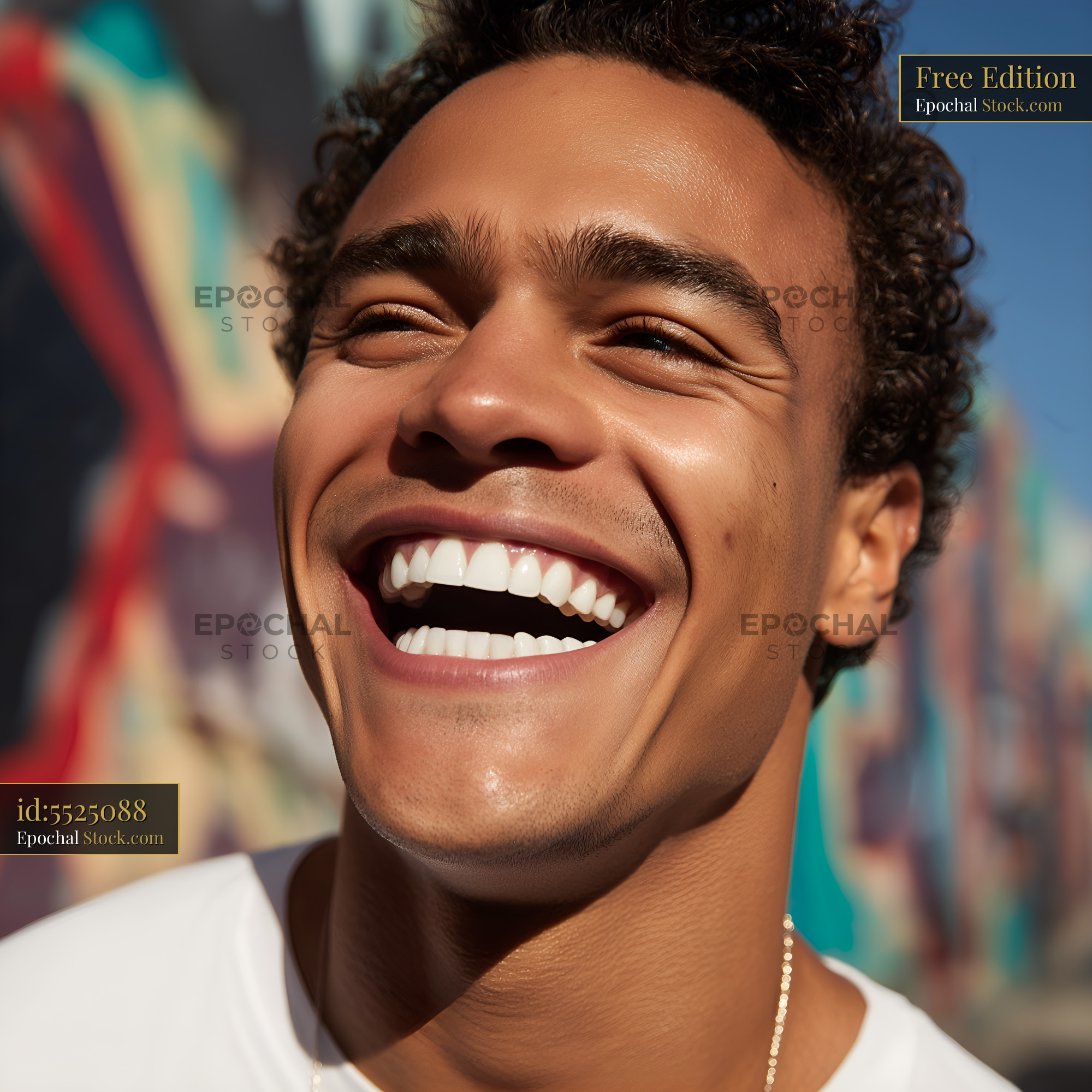 Man smiles broadly in front of colorful mural Free Premium Stock Photo