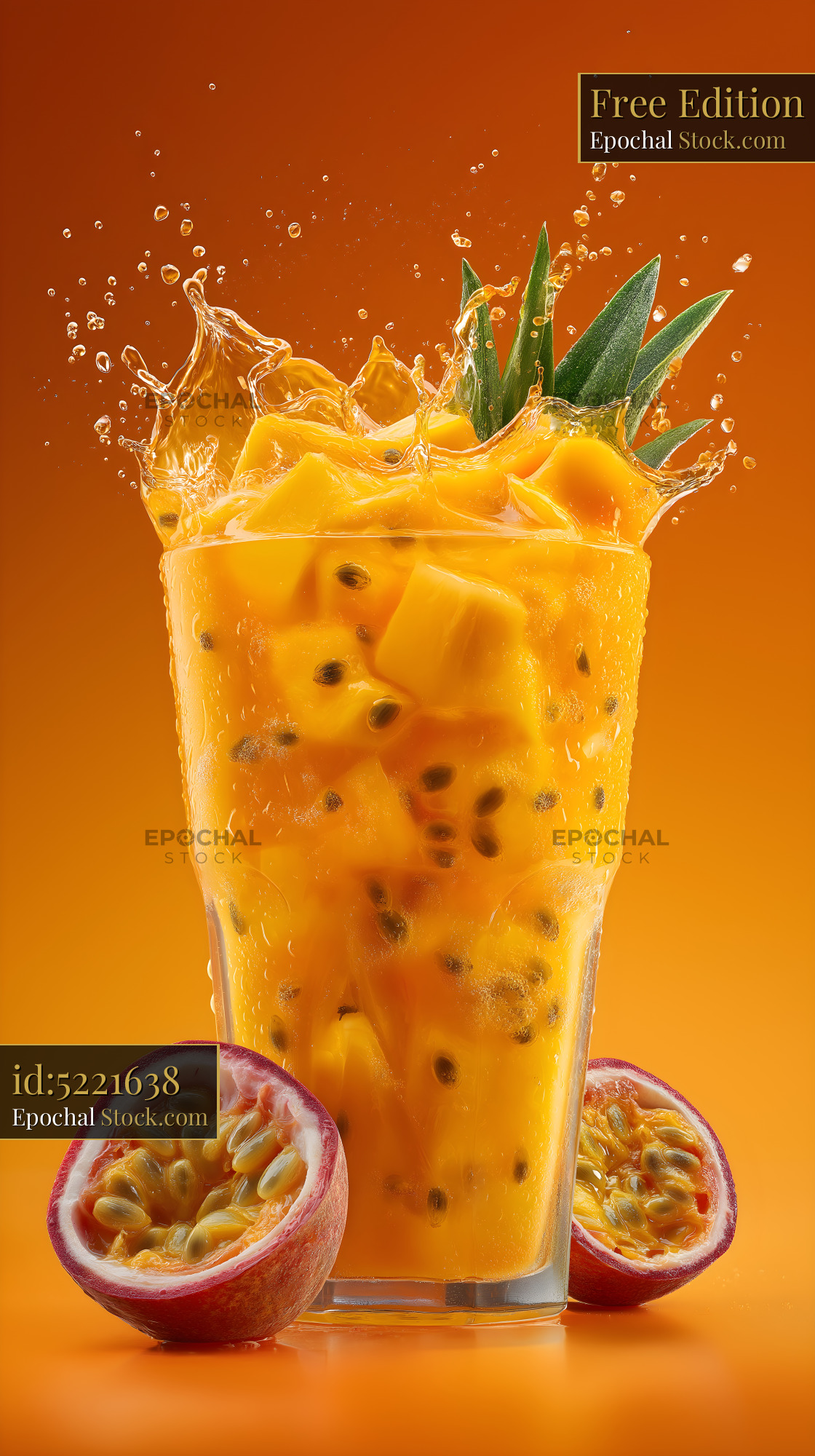 The drink mixes fresh mango pieces and passion fruit in a clear glass. Water splashes out, creating a lively scene. The bright orange background adds energy to the moment.