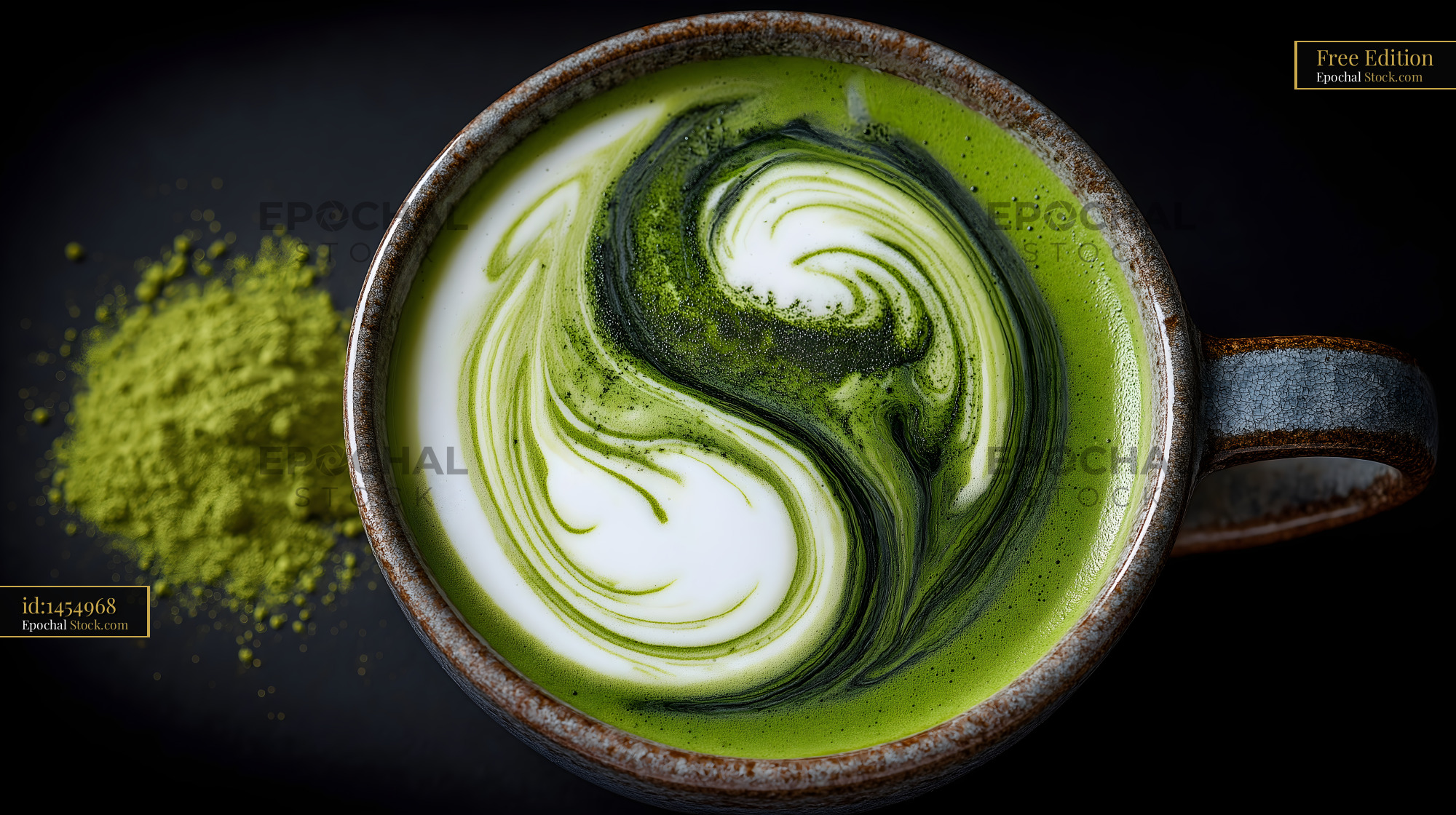 Matcha drink with milk swirls in a cup and powder on table Free Premium Stock Photo
