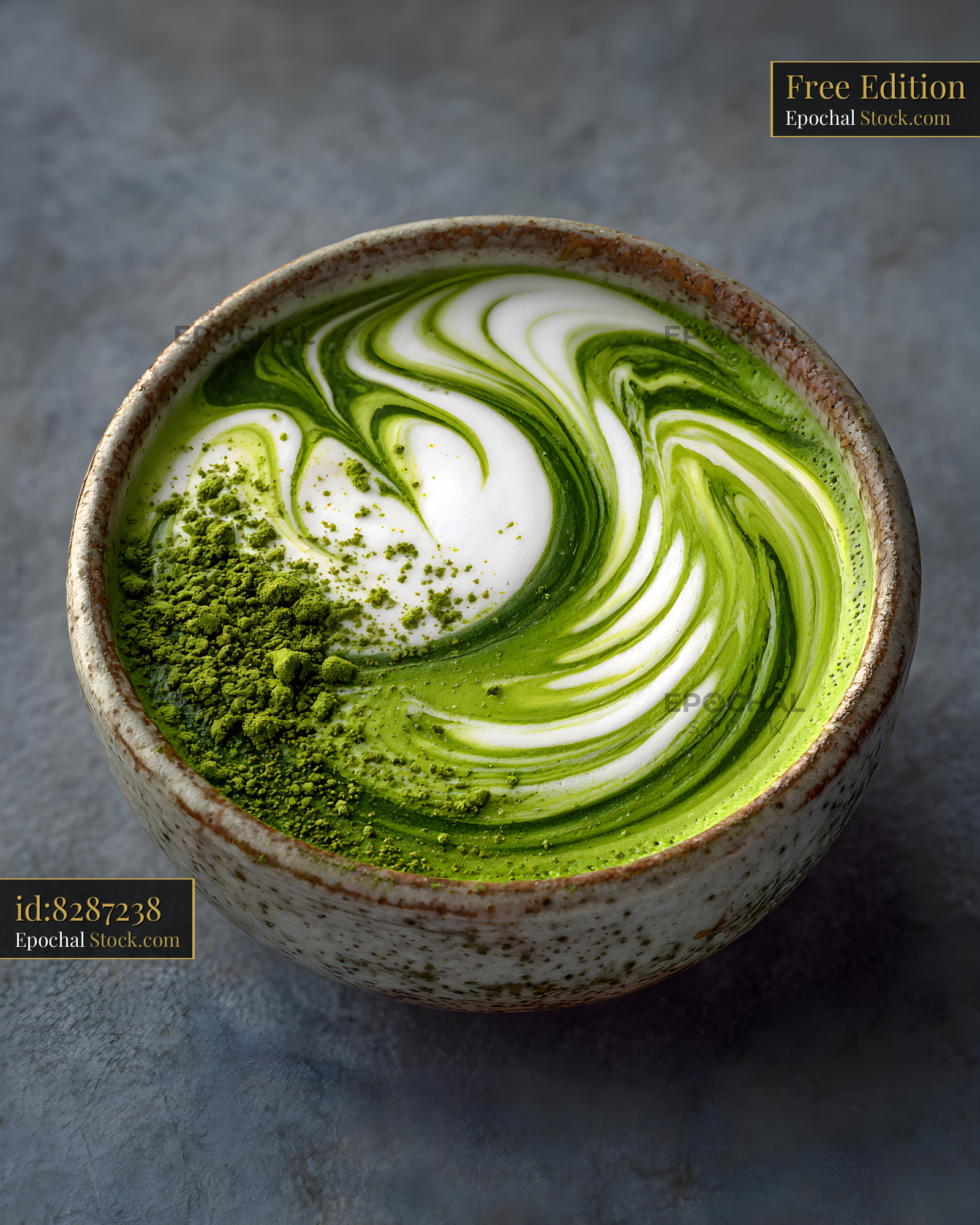 A bowl contains matcha tea topped with cream. The green tea shows a swirl pattern with a sprinkle of green powder on one side. This drink is popular in many cafes worldwide.