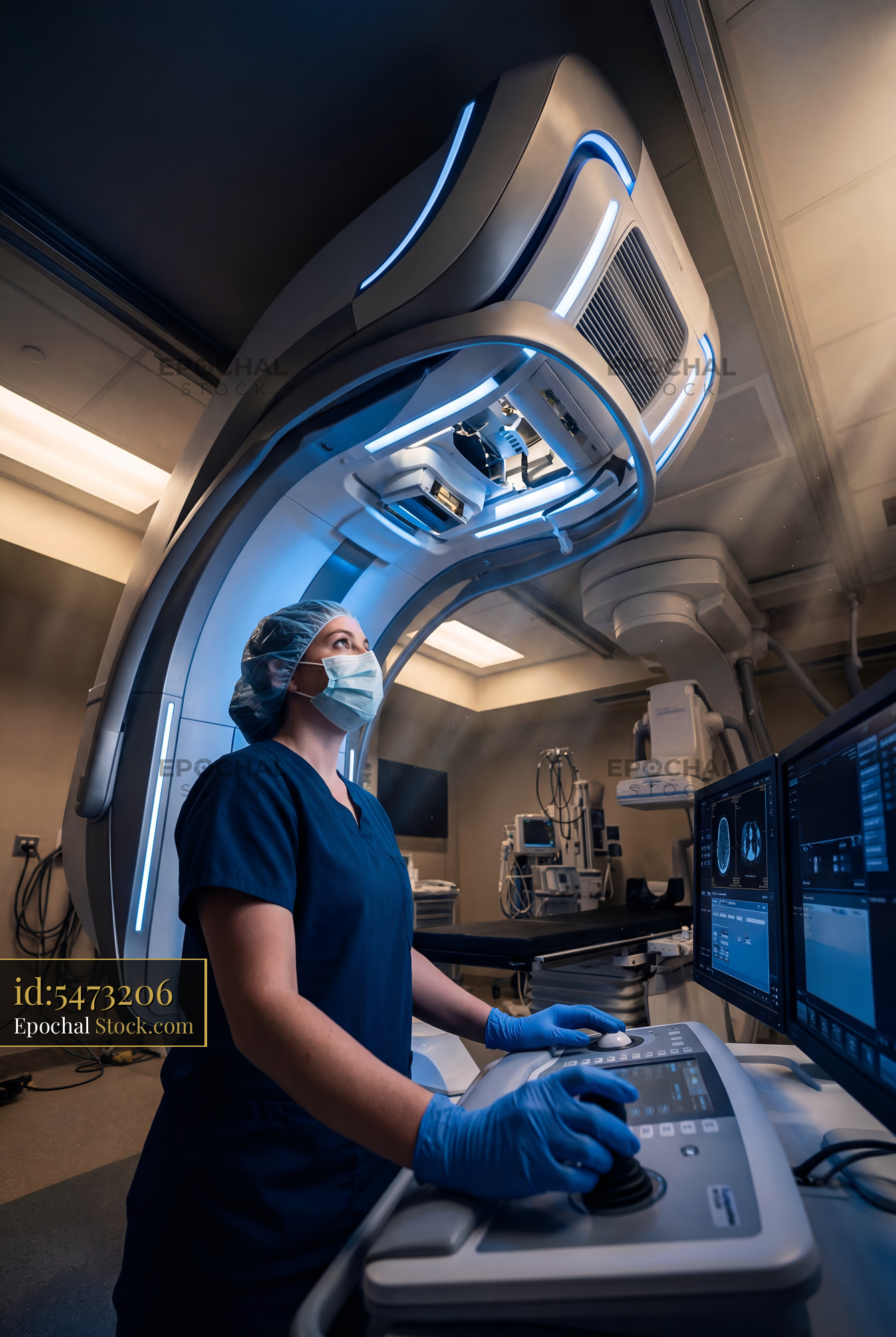 A medical professional stands in a lab while using advanced imaging equipment. The person is focused on the controls, with screens displaying diagnostic information nearby.