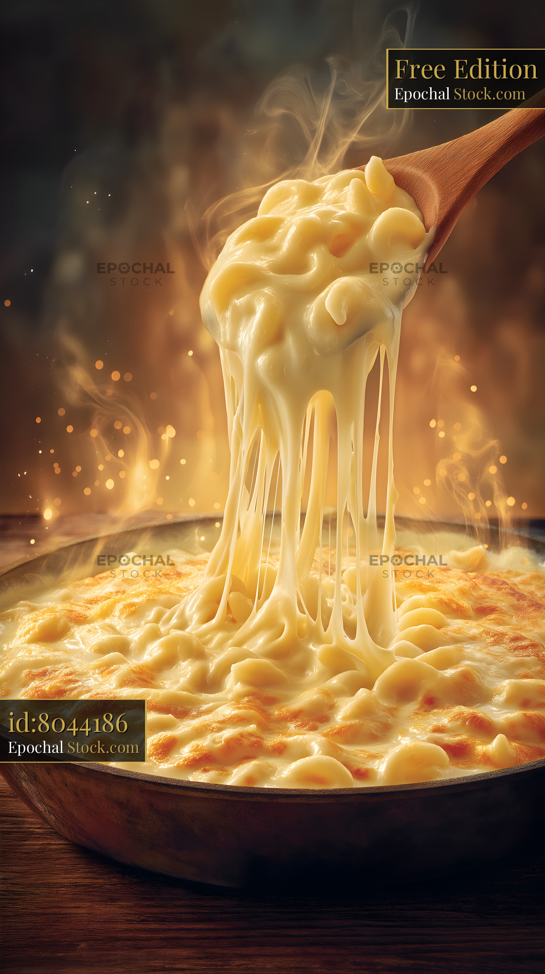 Melted cheese pulling from creamy macaroni dish on wooden table Free Premium Stock Photo
