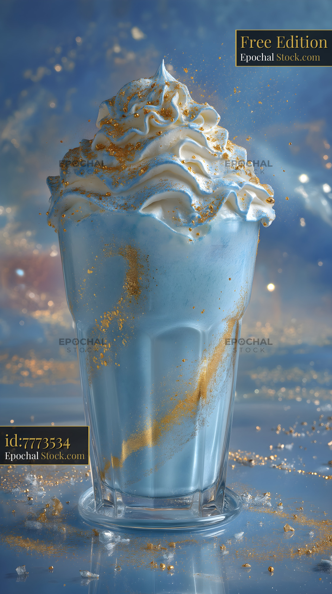A milkshake is in a clear glass on a shiny surface. The drink features whipped cream on top with golden sprinkle decorations. The background has a soft blue hue.