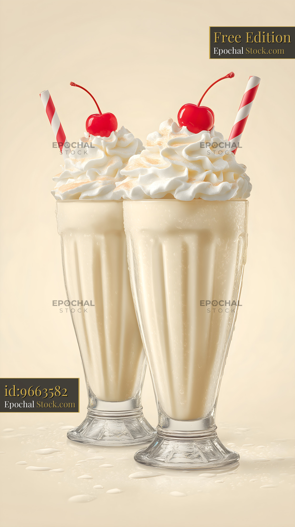 Two tall glasses hold creamy milkshakes topped with whipped cream and cherries. Red and white striped straws add a fun touch. This drink is ready to be enjoyed.