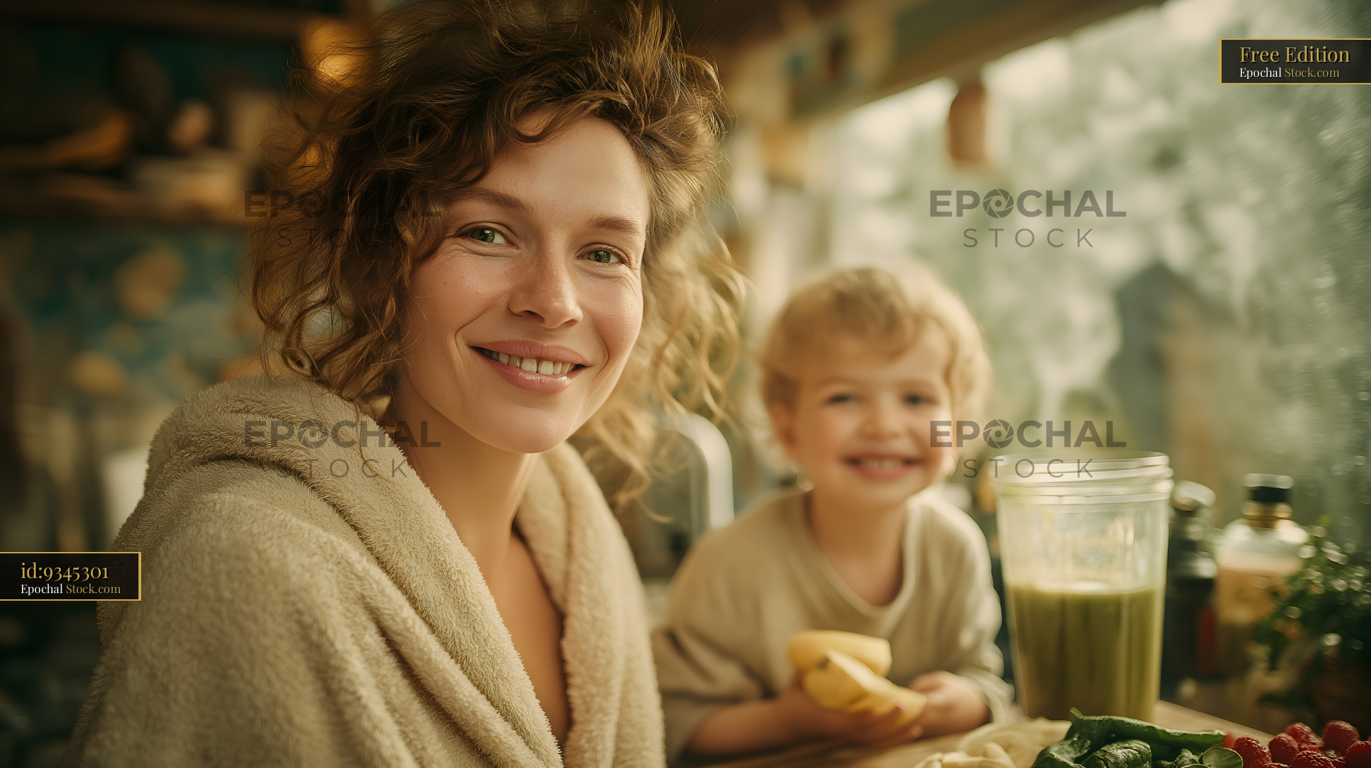 A woman and young boy are sitting at a table with food in front of them. They smile happily while enjoying breakfast in a cozy kitchen setting. Sunlight shines through the window.