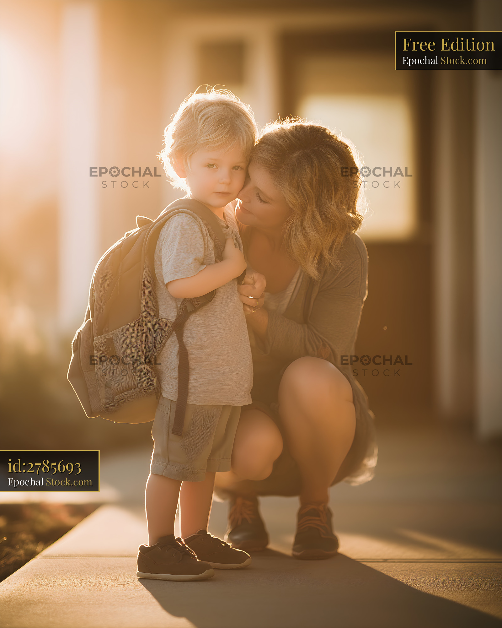 Mother helps son with backpack before school in sunlight Free Premium Stock Photo