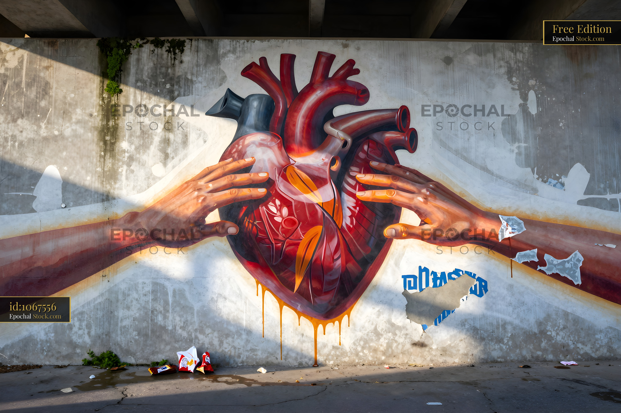 Mural showing hands reaching for a heart on a concrete wall Free Premium Stock Image