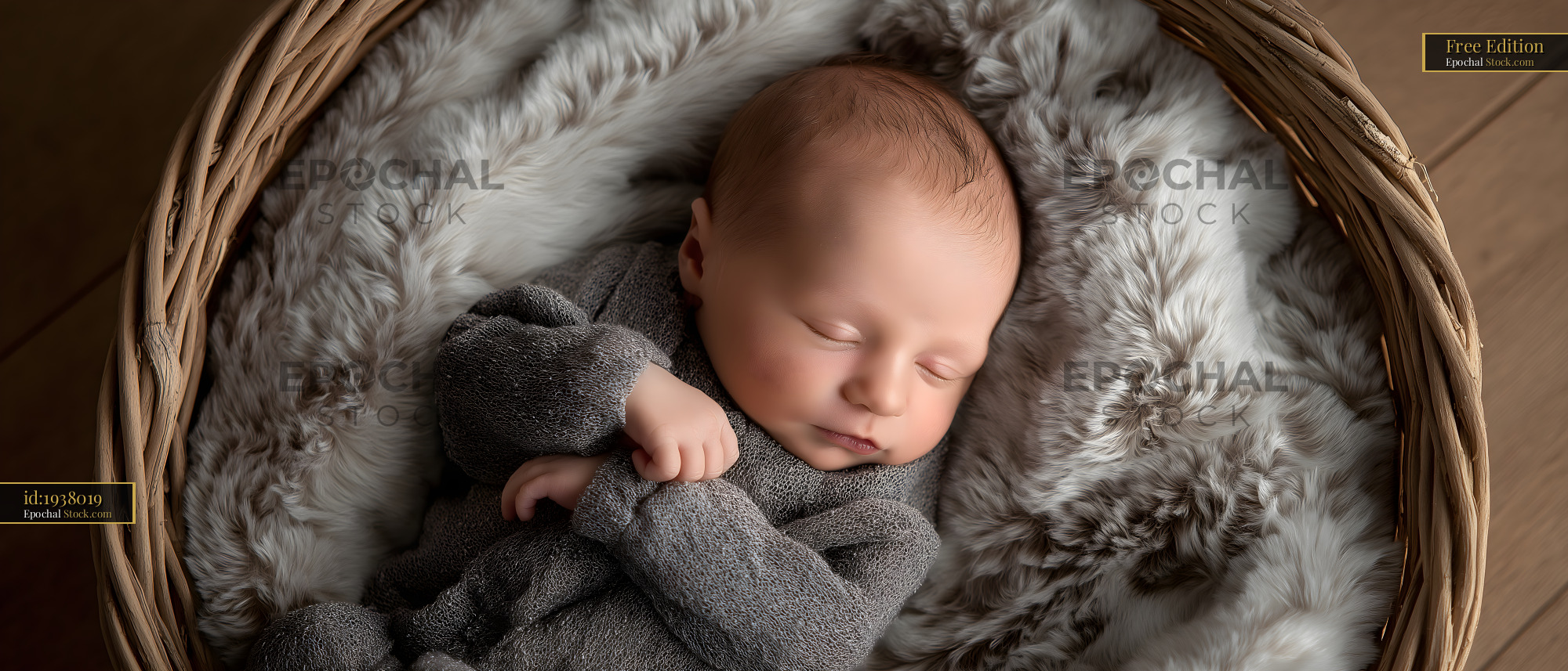 Newborn baby rests in a woven basket on a soft blanket Free Premium Stock Photo