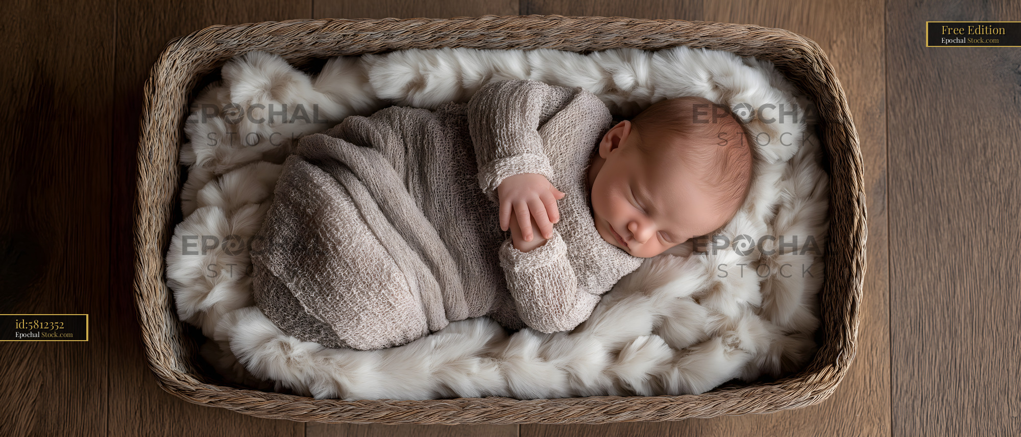 Newborn sleeps in a cozy basket on a wooden floor Free Premium Stock Image