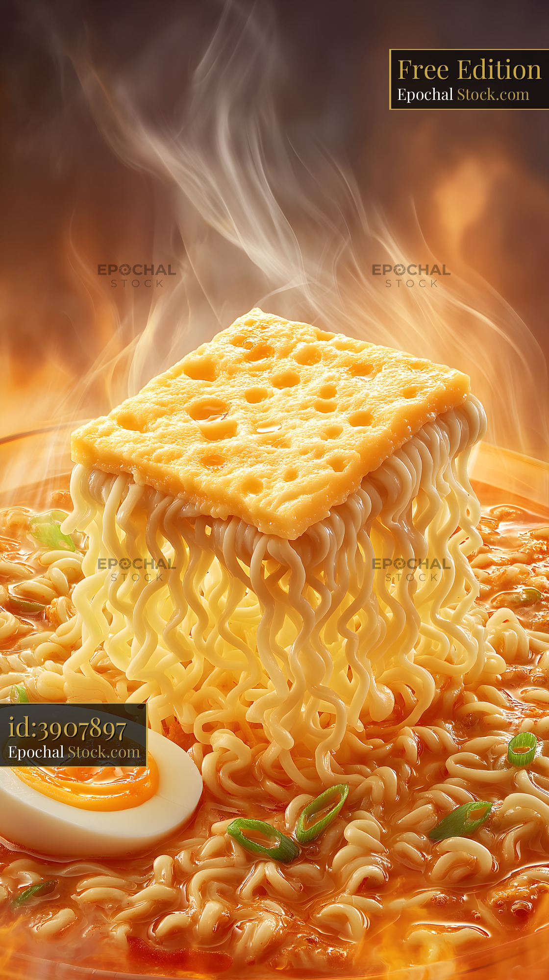 A bowl of noodles sits on a table with melted cheese on top. A boiled egg and green onions are beside the noodles. Steam rises from the bowl. The setting appears warm and inviting.
