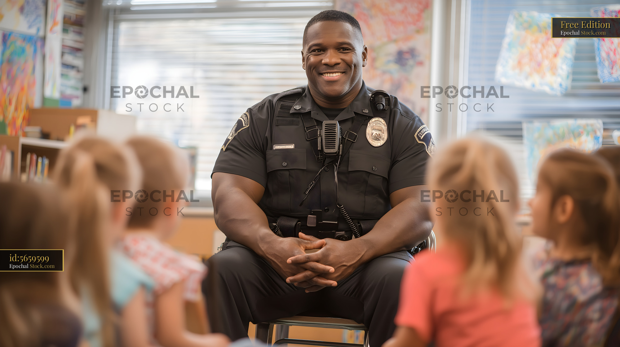 Officer sits with children during school visit in classroom Free Premium Stock Image