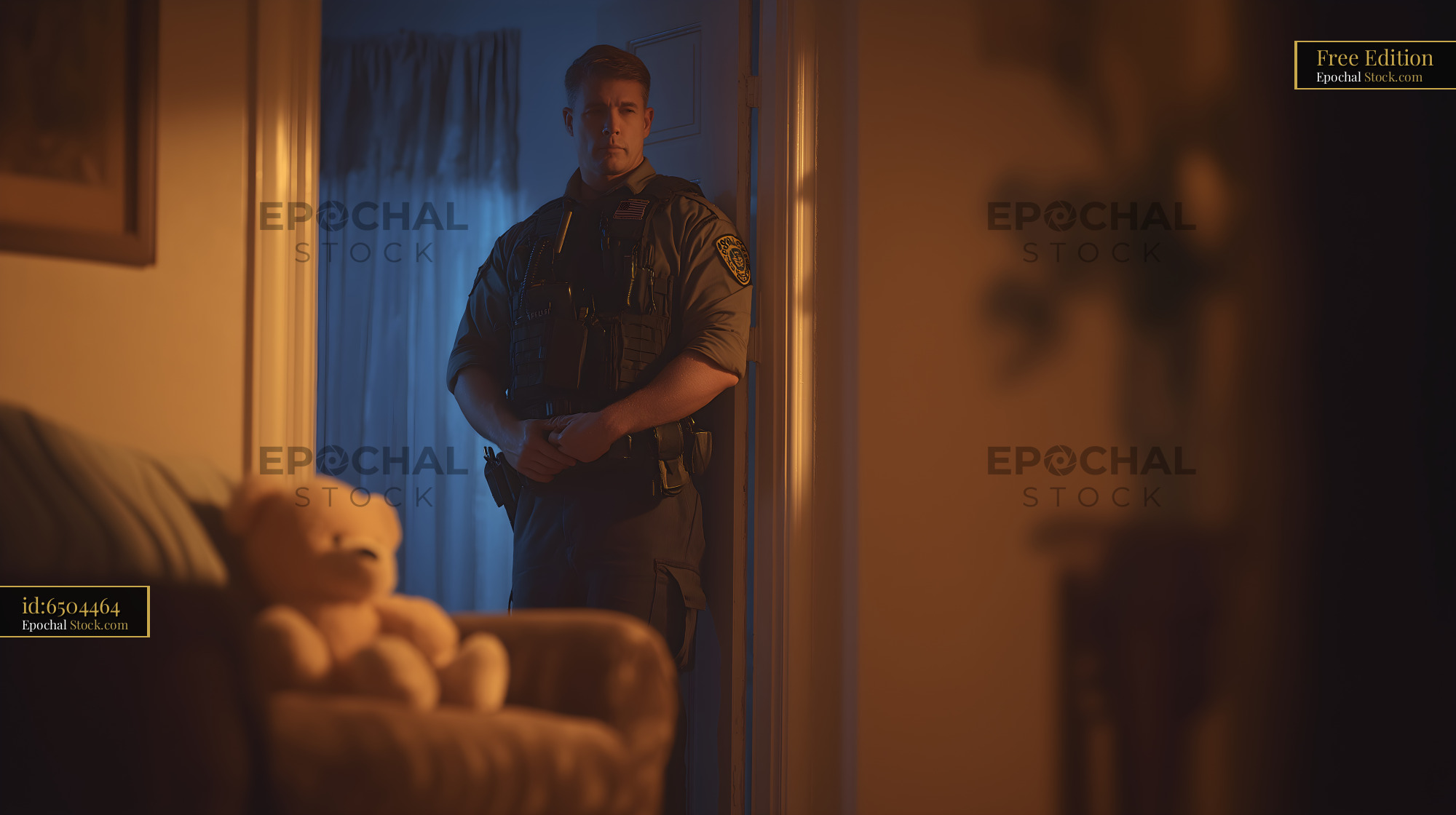 A police officer watches from a hallway in a home. A teddy bear rests on a couch nearby. The scene shows a quiet moment in the night. Light filters through the curtains.