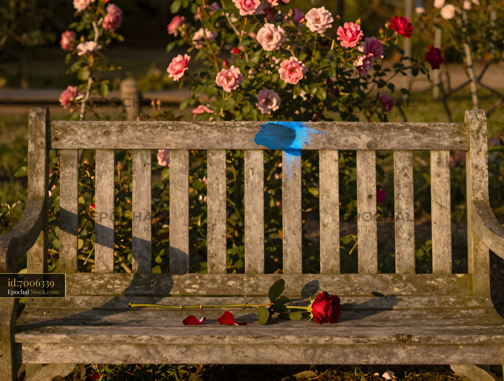 A wooden bench sits in a garden surrounded by blooming roses. A red rose is placed on the bench along with some petals. A blue mark is on the backrest of the bench.