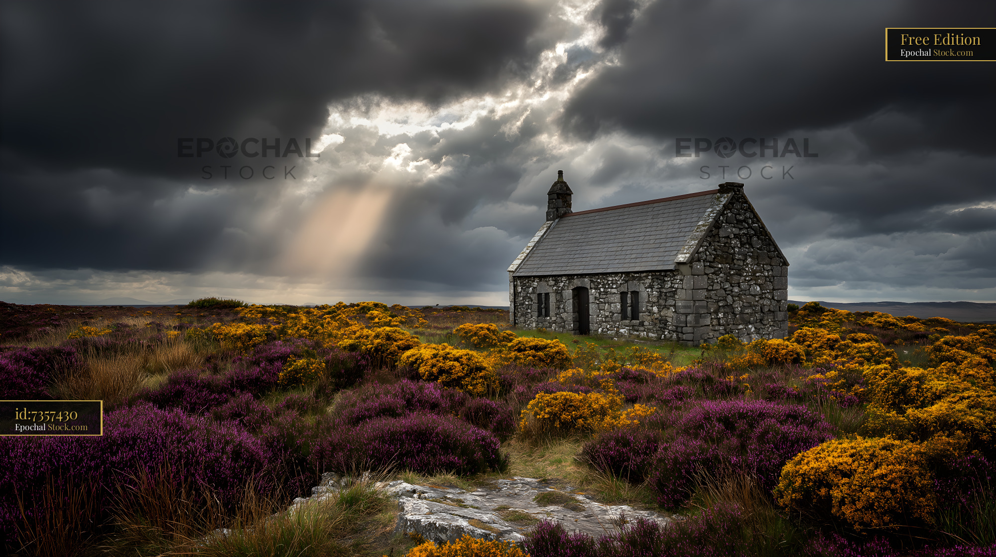 A stone house is located in a field filled with purple and yellow flowers. Dark clouds fill the sky, and a beam of light shines down on the house. The scene shows nature and weather.