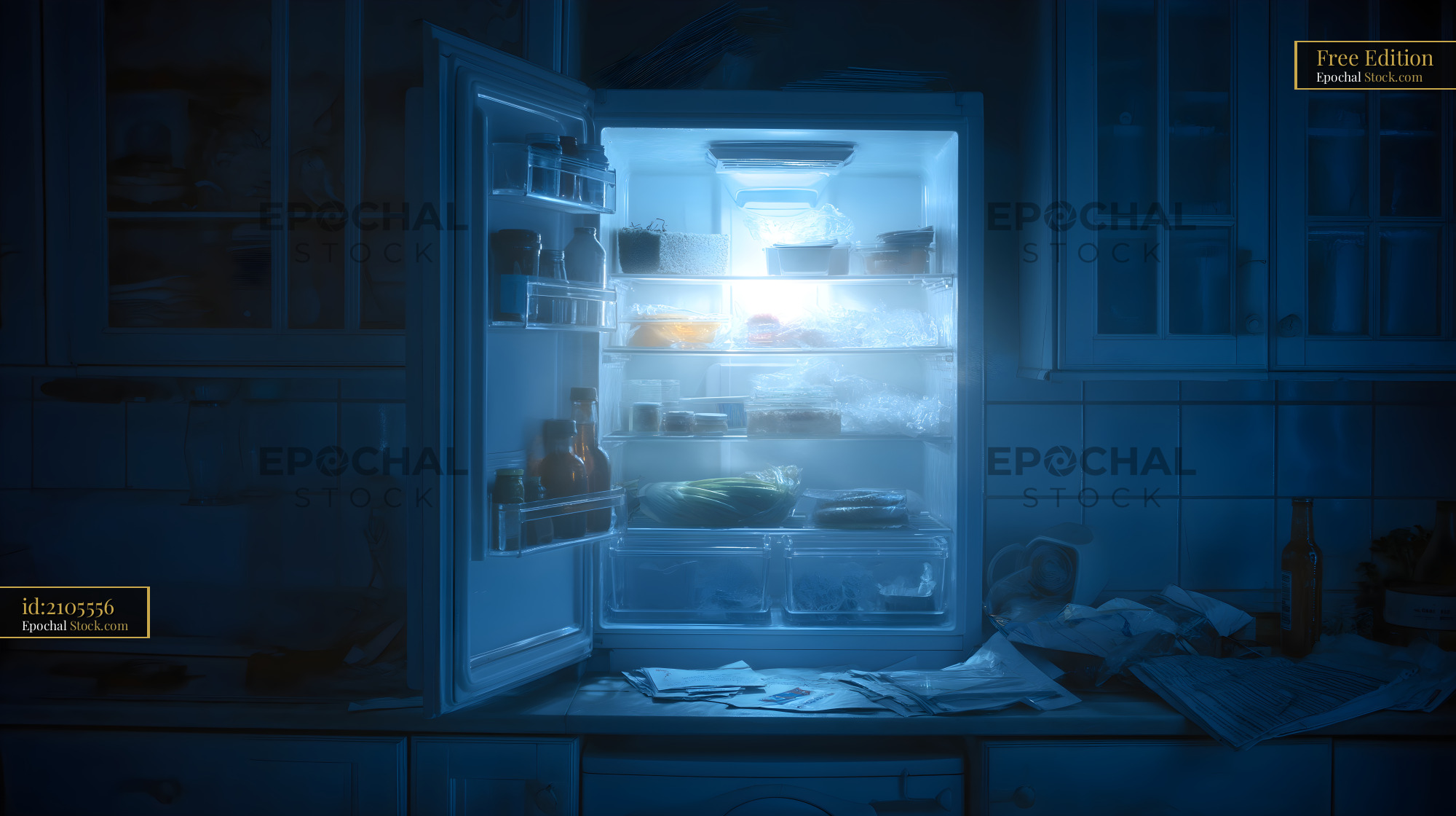 Open refrigerator at night in a kitchen Free Premium Stock Image