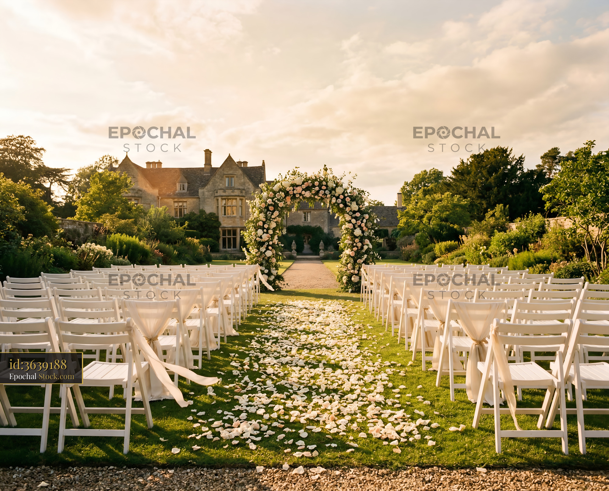Guests prepare to attend a wedding ceremony in a garden. White chairs are set up in rows facing a floral arch. The sun sets behind a historic building in the background.