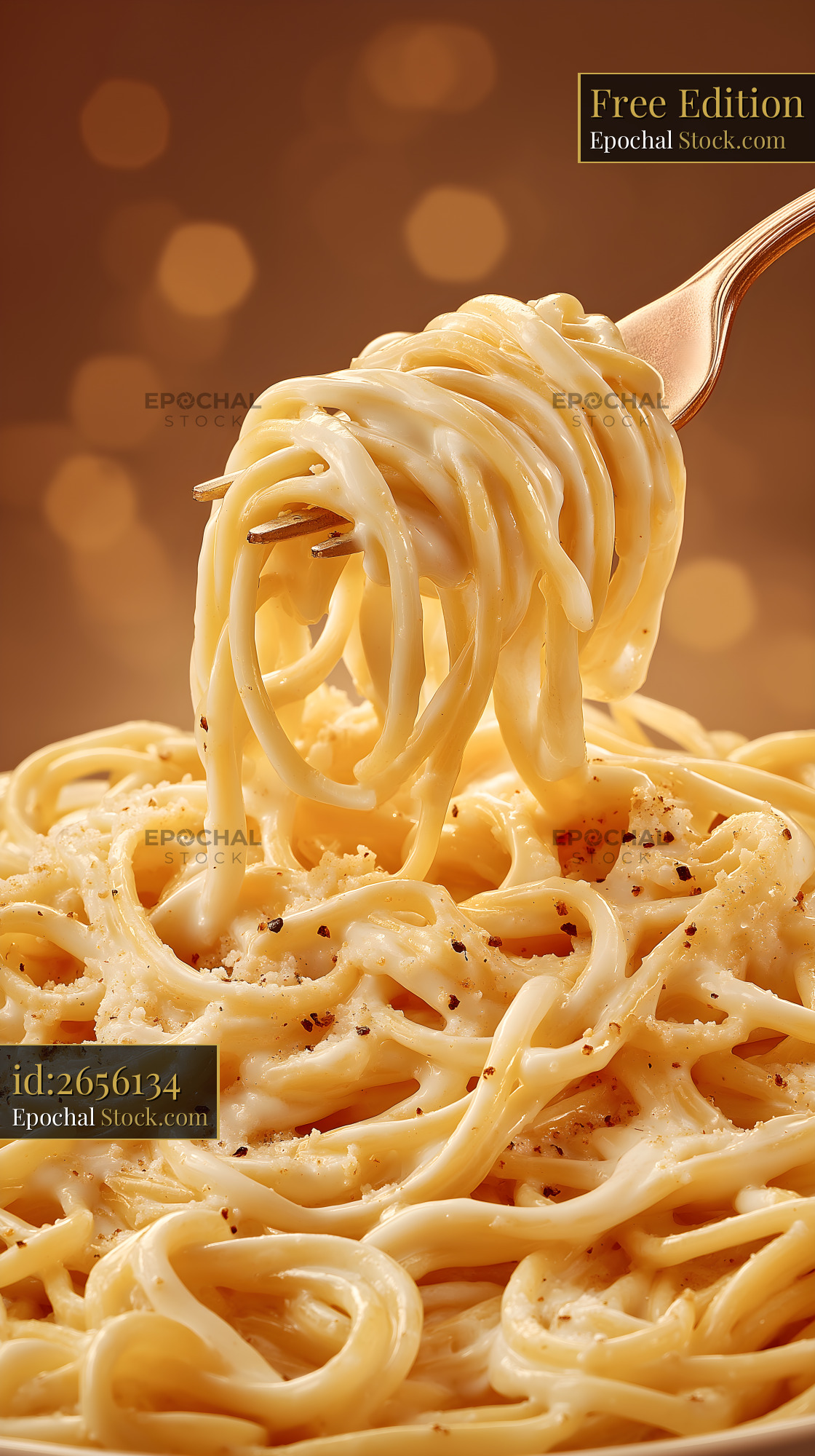 Pasta twirling on a fork with creamy sauce in a warm setting Free Premium Stock Photo