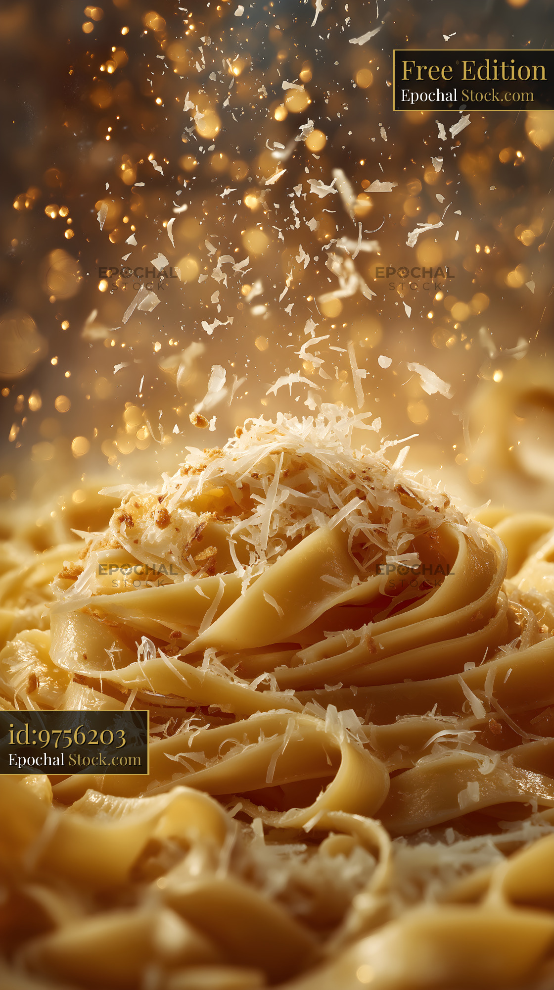 A plate of pasta is shown as cheese is sprinkled on top. The scene captures the moment of preparation in a kitchen. Bubbles and sparks are visible in the air, adding energy to the cooking process.