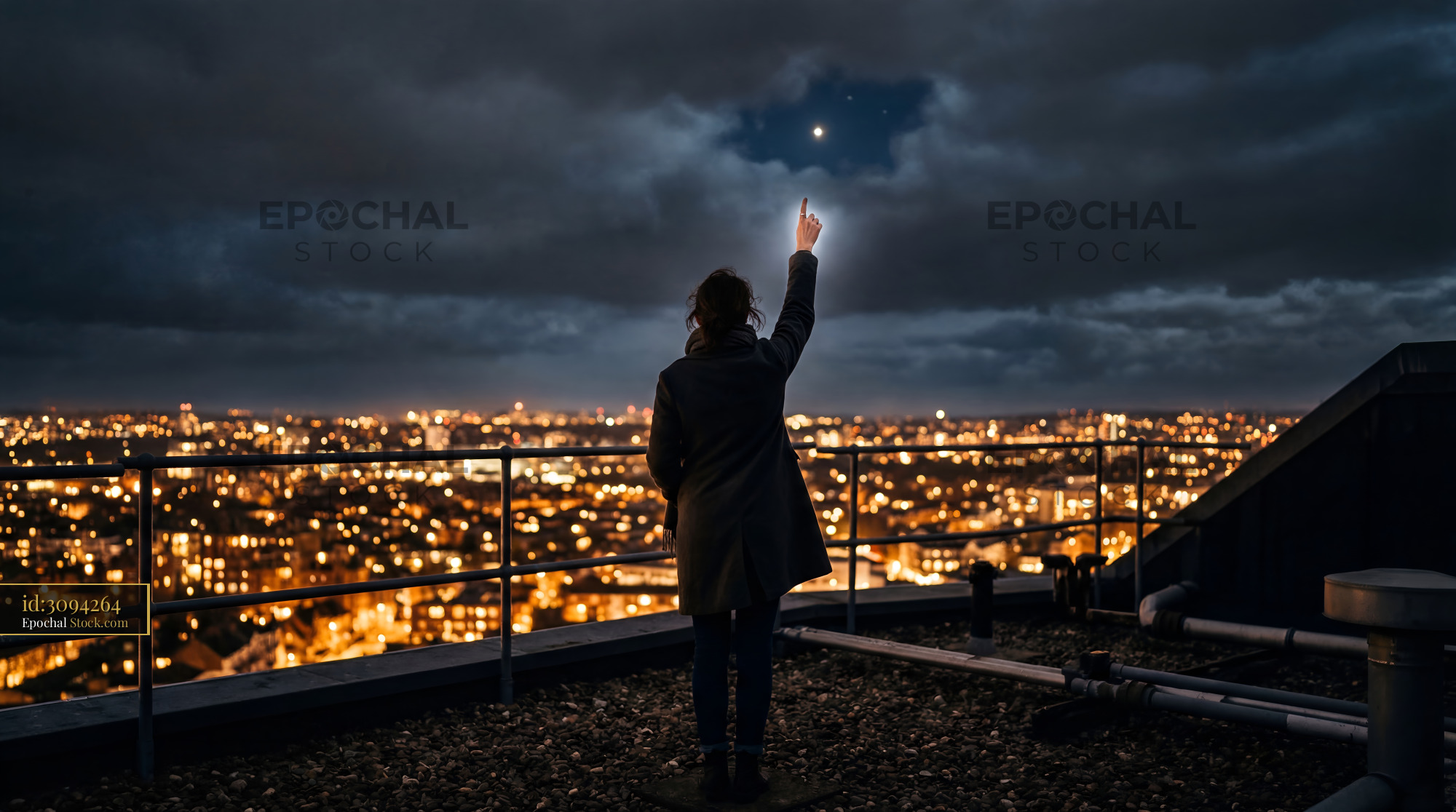 Person points at the sky from a rooftop at night Premium Stock Photo
