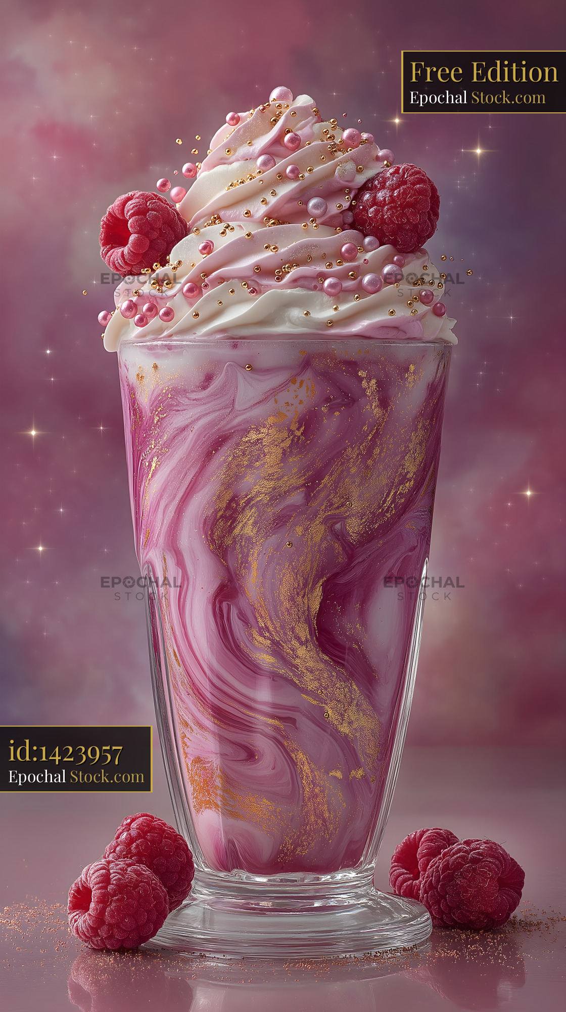 The glass holds a pink dessert drink swirled with cream. Topped with whipped cream and raspberries, the drink has a shiny finish. The background has soft colors that add to the scene.