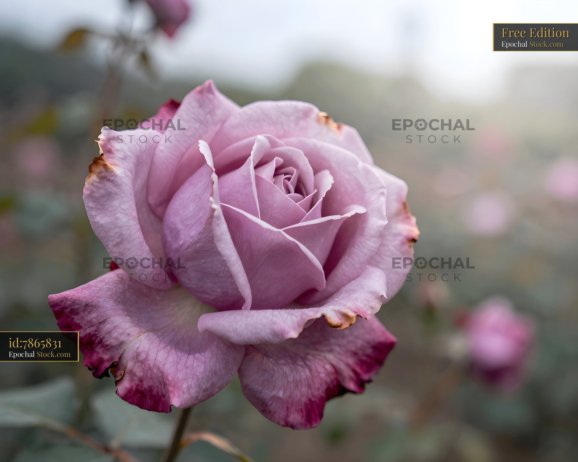 A pink rose stands tall in a garden. The rose has light petals and some dark edges. Other flowers bloom in the background under a bright sky.