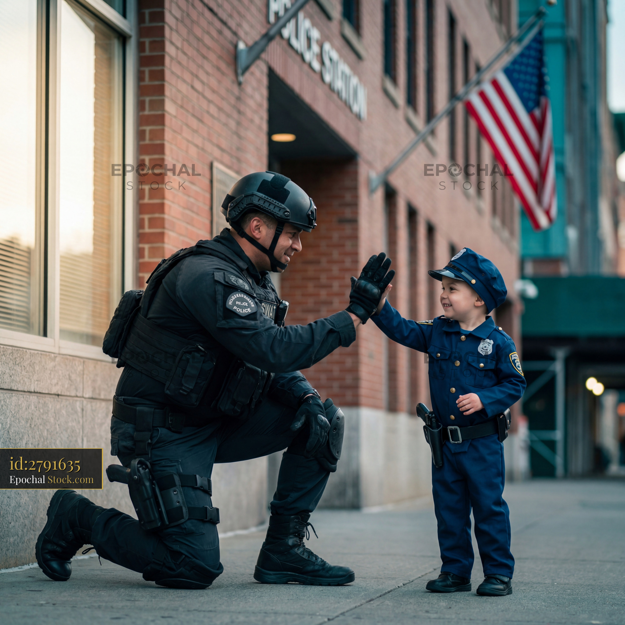 A police officer kneels and exchanges a high five with a child dressed in a police uniform outside a police station. The setting is urban during the day, with a flag in the background.