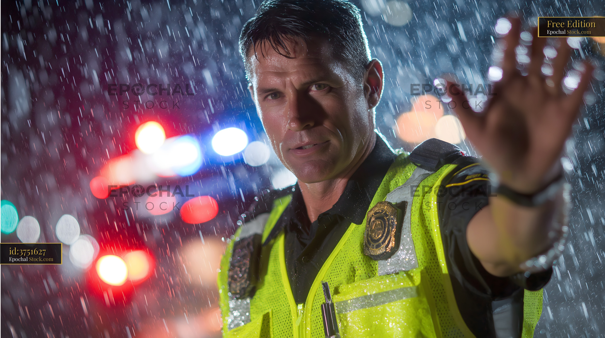 A police officer stands in the rain with a bright vest, holding up a hand to stop vehicles. Red and blue lights flash from a police car behind him. The scene shows a busy urban environment at night.