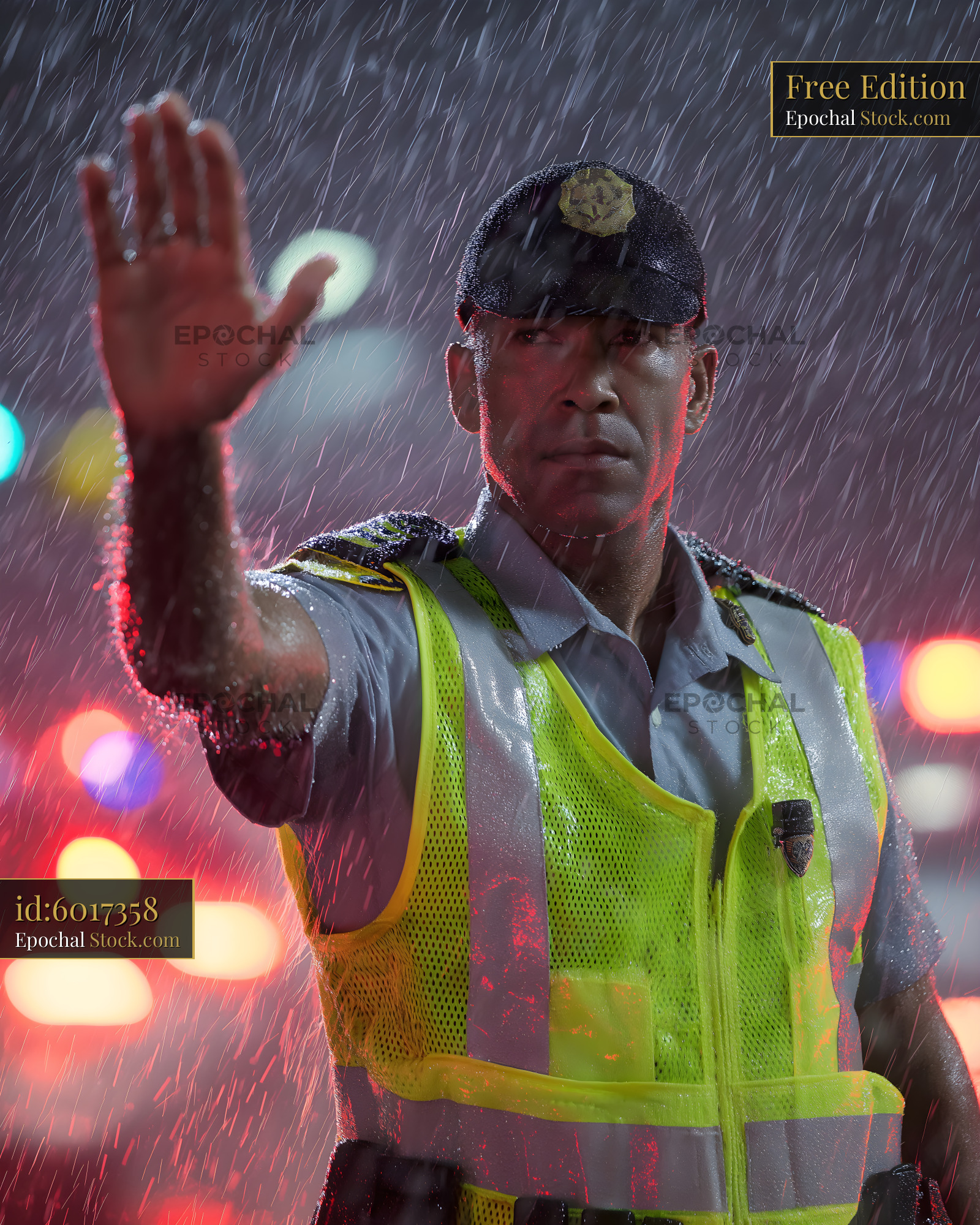 Police officer directs traffic during heavy rainstorm at night Free Premium Stock Image