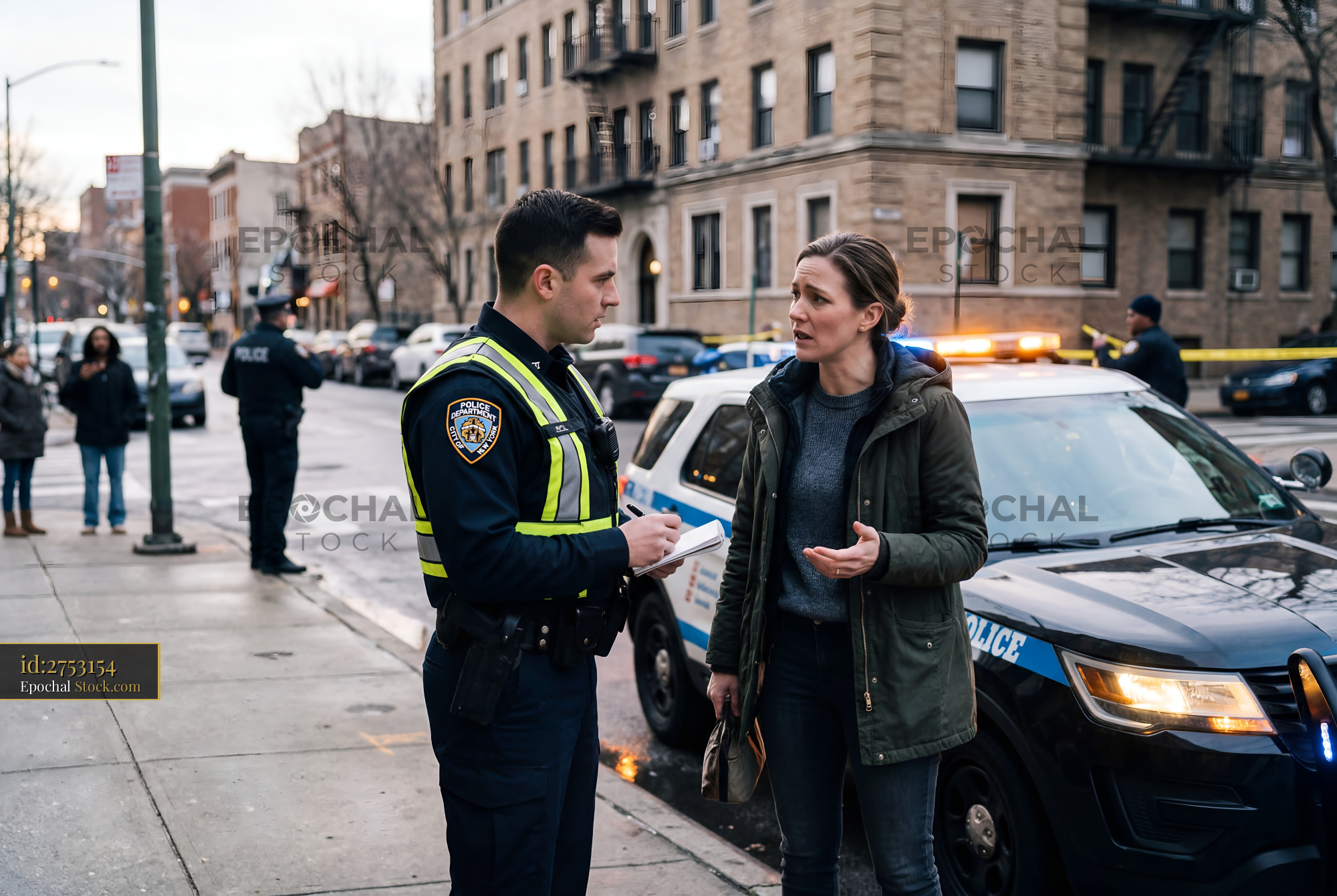 Police officer takes statement from woman in urban setting Premium Stock Image