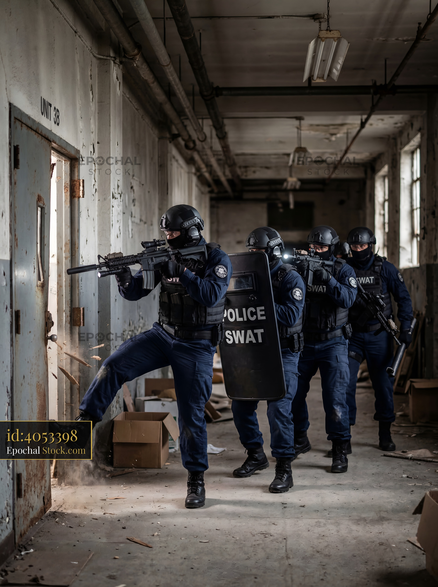 Police SWAT team executes entry in abandoned building Premium Stock Image