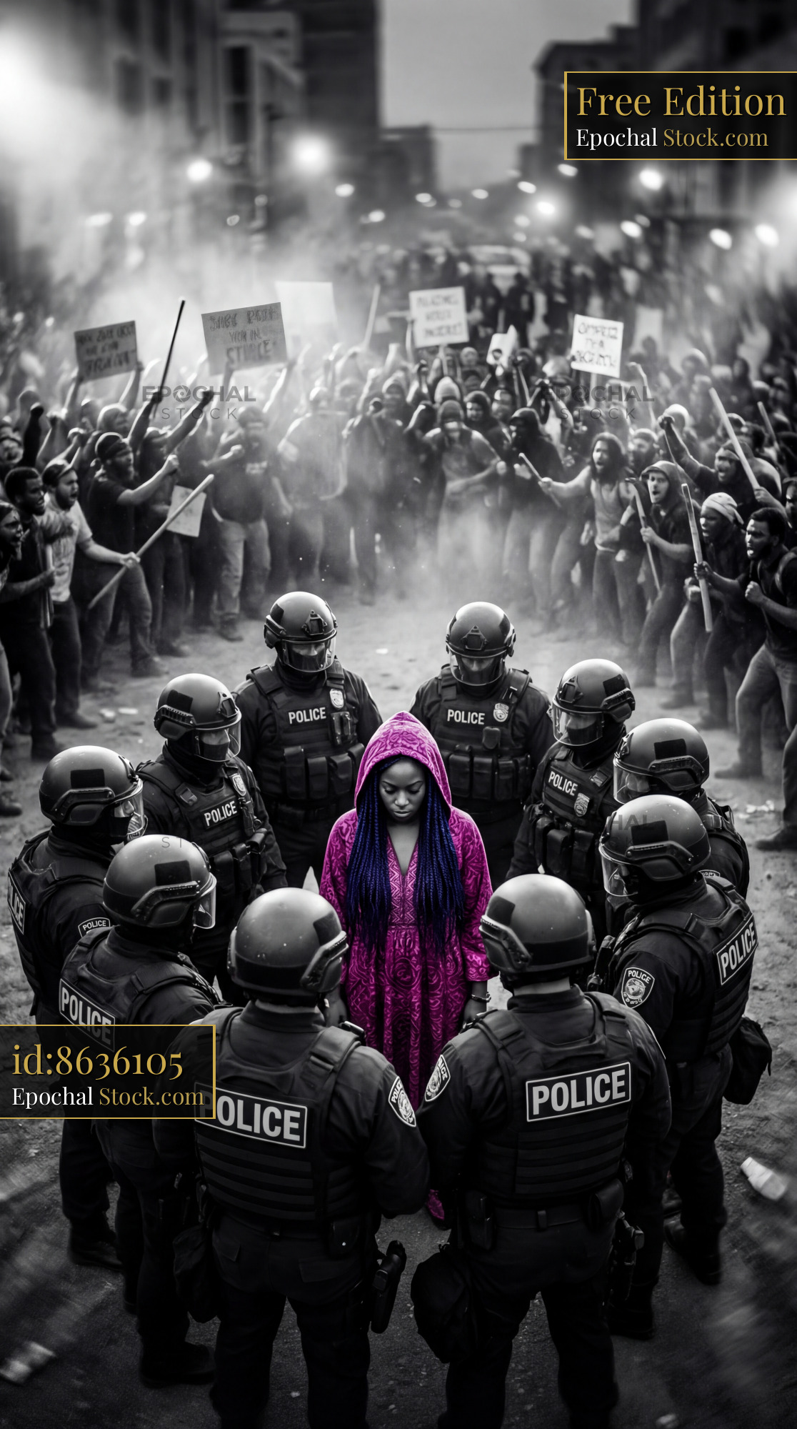 A woman in a pink coat stands among police officers at a protest. A large crowd gathers around holding signs. The scene shows tension as both sides face each other.