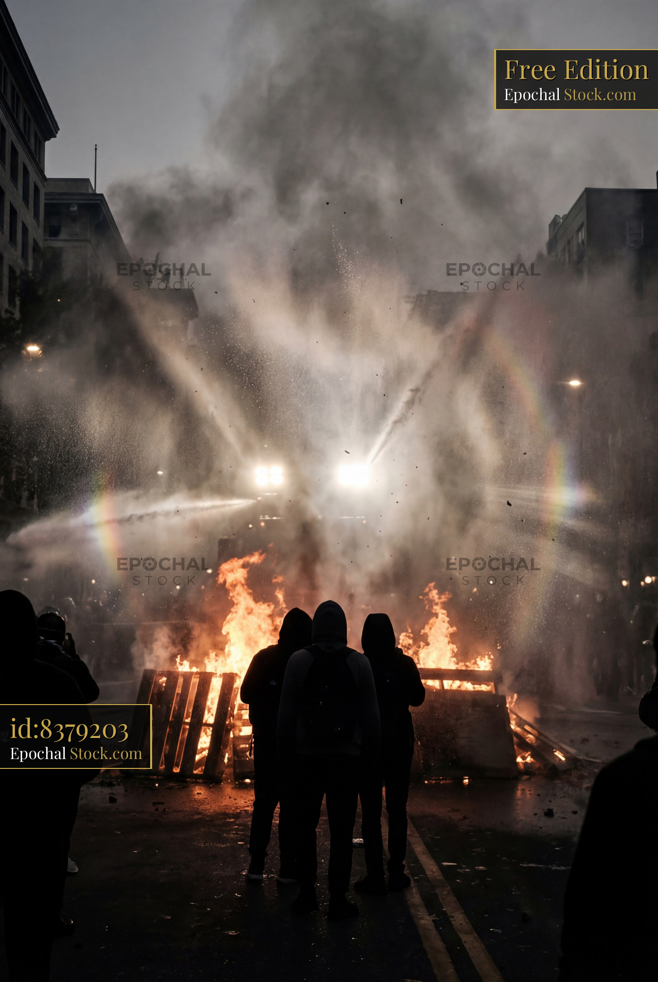 People stand in front of a large fire during a protest at night. Smoke fills the air while bright lights shine down. The atmosphere is charged with tension as the crowd engages.