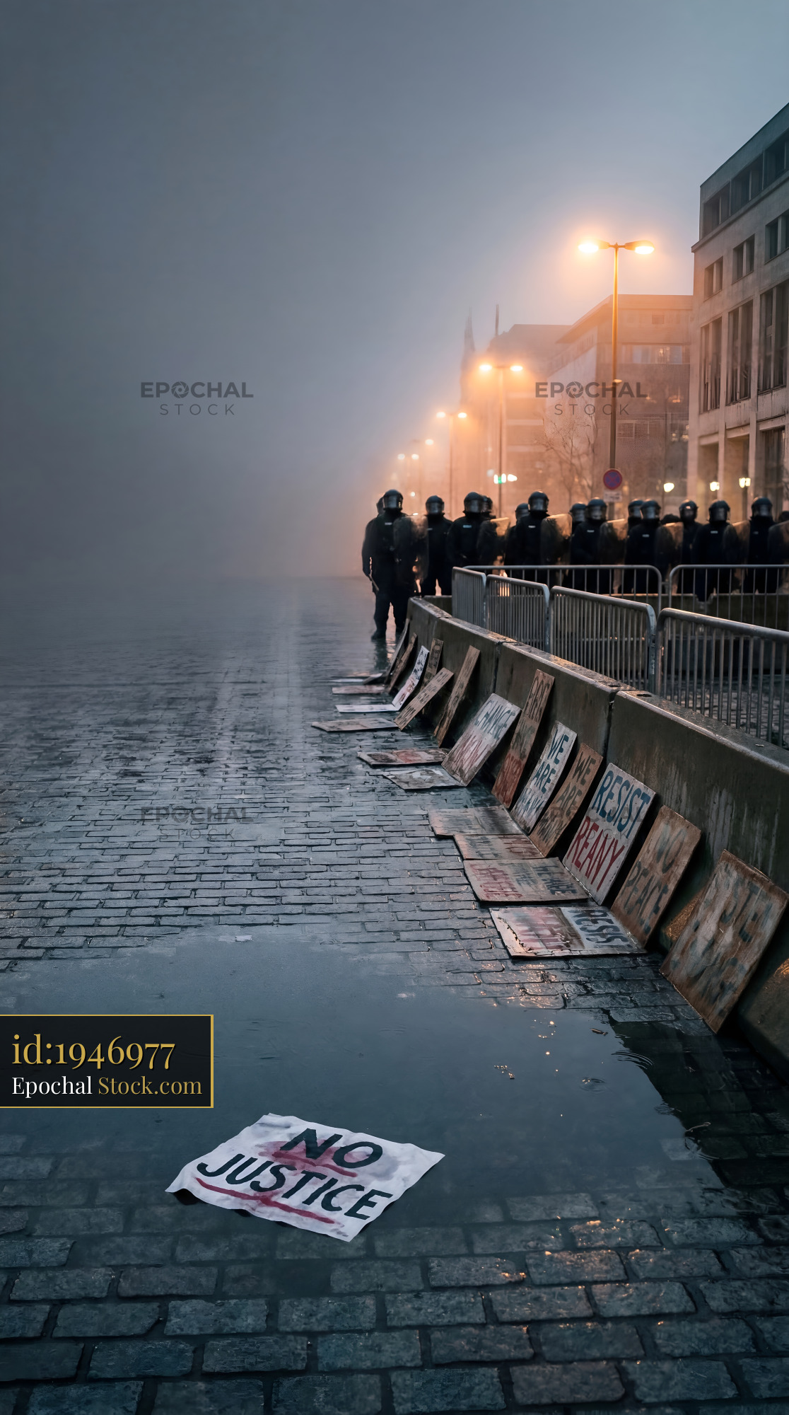 A group of people holding signs stands along a wet street at night. Police officers watch from behind barriers as fog covers the scene. Tension is evident in the atmosphere.